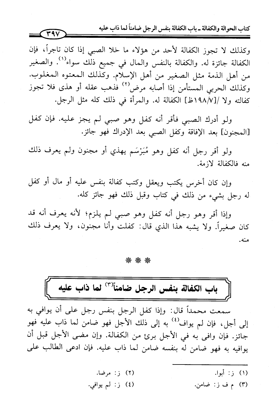 وكذلك لا تجوز الكفالة لأحد من هؤلاء ما خلا الصبي إذا كان تاجراً، فإن الكفالة جائزة له. والكفالة بالنفس والمال في جميع ذلك سواء (¬1). والصغير من أهل الذمة مثل الصغير من أهل الإسلام. وكذلك المعتوه المغلوب. وكذلك الحربي المستأمن إذا أصابه مرض (¬2) فذهب عقله أو هذى فلا تجوز كفالته ولا الكفالة له. والمرأة في ذلك كله مثل الرجل.