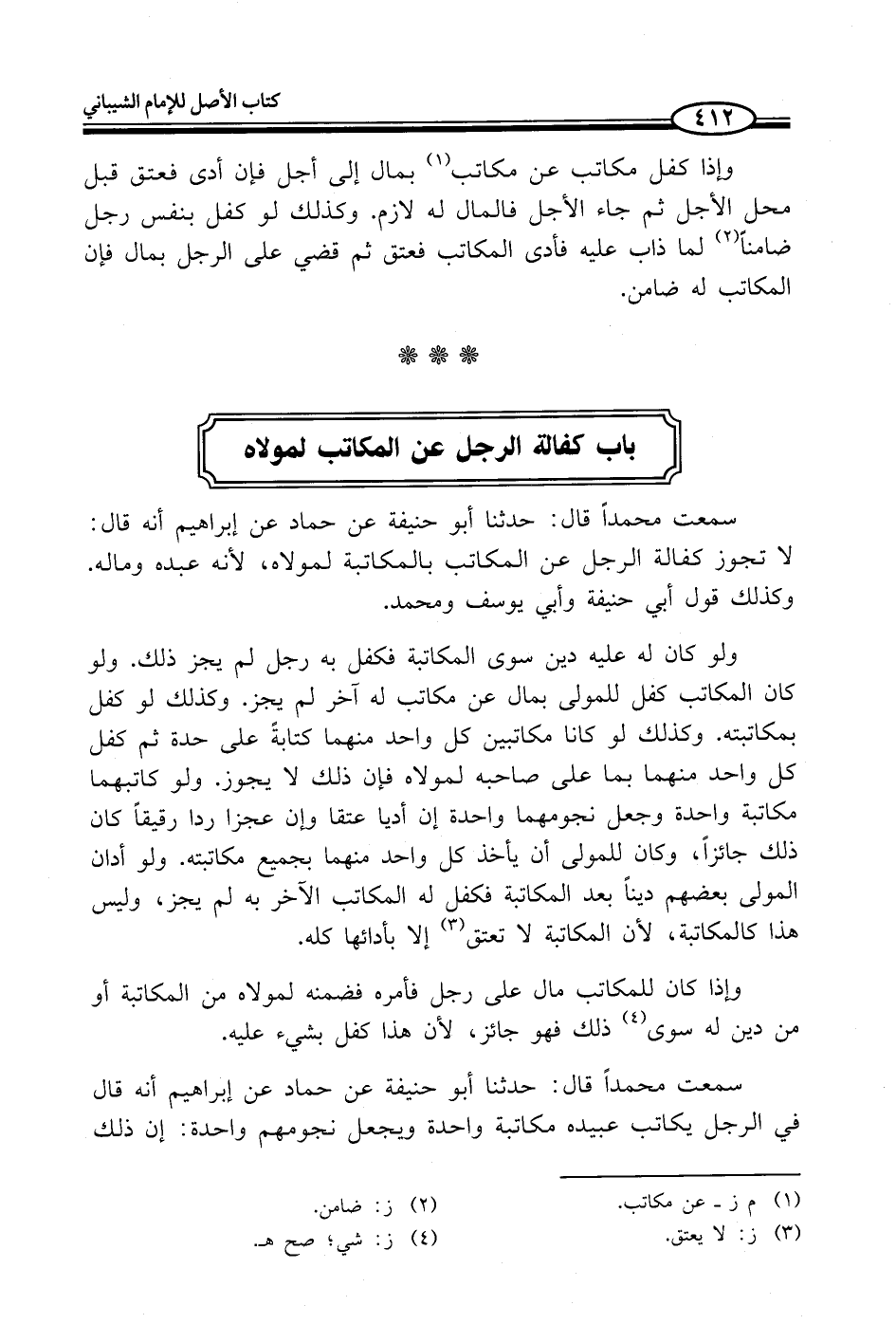 سمعت محمداً قال: حدثنا أبو حنيفة عن حماد عن إبراهيم أنه قال: لا تجوز كفالة الرجل عن المكاتب بالمكاتبة لمولاه، لأنه عبده وماله. وكذلك قول أبي حنيفة وأبي يوسف ومحمد.