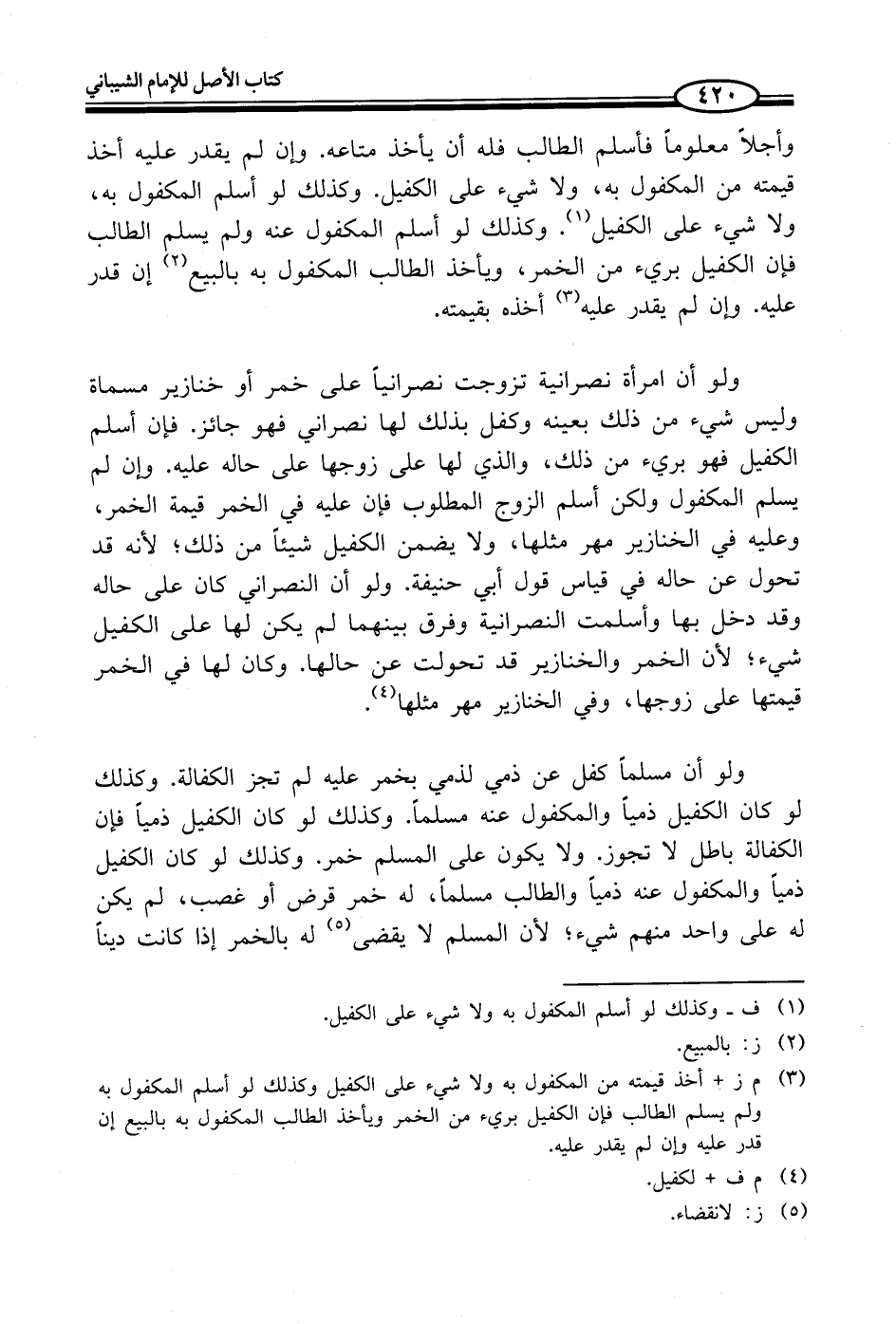 ولو أن امرأة نصرانية تزوجت نصرانياً على خمر أو خنازير مسماة وليس شيء من ذلك بعينه وكفل بذلك لها نصراني فهو جائز. فإن أسلم الكفيل فهو بريء من ذلك، والذي لها على زوجها على حاله عليه. وإن لم يسلم المكفول ولكن أسلم الزوج المطلوب فإن عليه في الخمر قيمة الخمر، وعليه في الخنازير مهر مثلها، ولا يضمن الكفيل شيئاً من ذلك؛ لأنه قد تحول عن حاله في قياس قول أبي حنيفة. ولو أن النصراني كان على حاله وقد دخل بها وأسلمت النصرانية وفرق بينهما لم يكن لها على الكفيل شيء؛ لأن الخمر والخنازير قد تحولت عن حالها. وكان لها في الخمر قيمتها على زوجها، وفي الخنازير مهر مثلها (¬4).