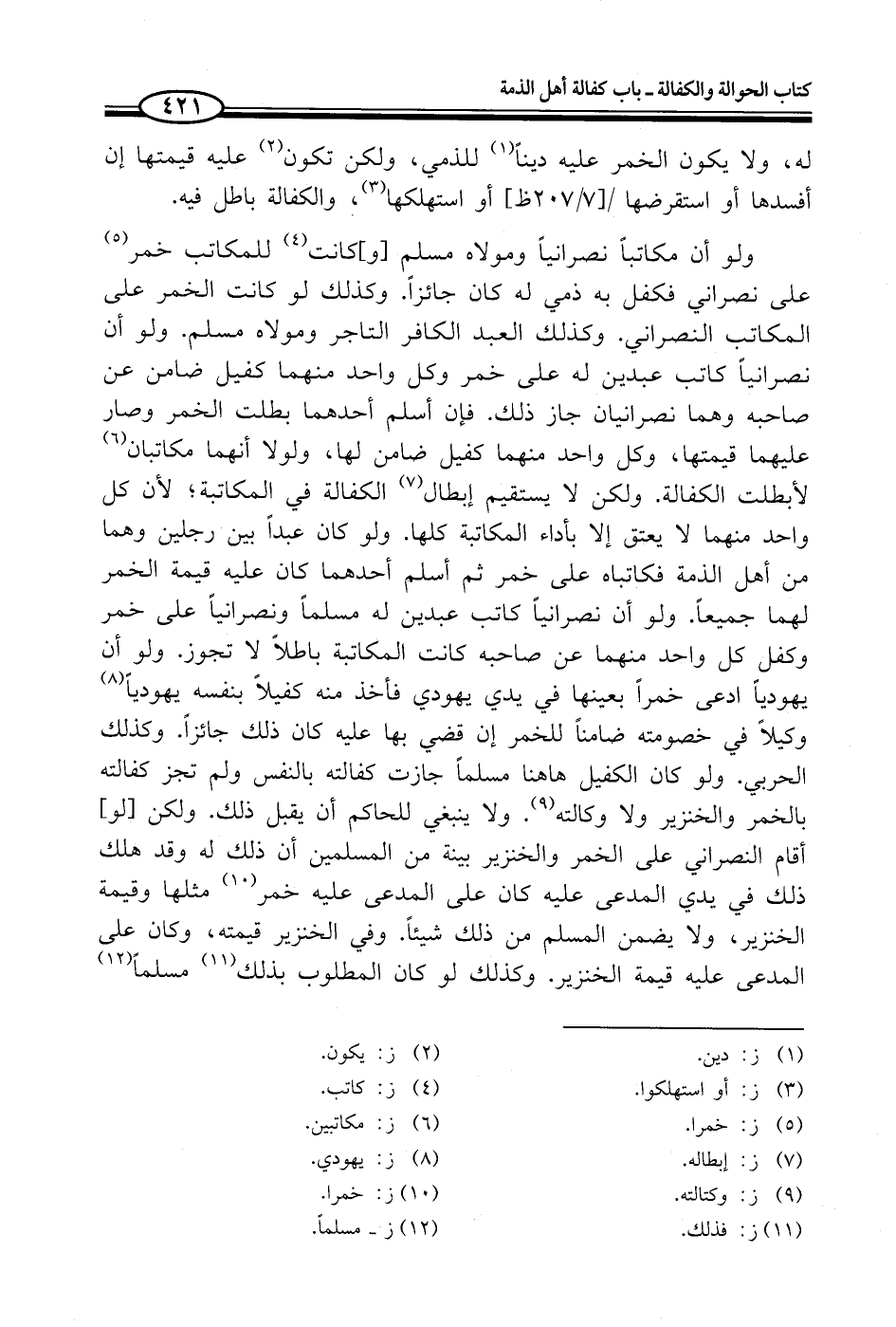 ولو أن مكاتباً نصرانياً ومولاه مسلم [وٍ] كانت (¬4) للمكاتب خمر (¬5) على نصراني فكفل به ذمي له كان جائزاً. وكذلك لو كانت الخمر على المكاتب النصراني. وكذلك العبد الكافر التاجر ومولاه مسلم. ولو أن نصرانياً كاتب عبدين له على خمر وكل واحد منهما كفيل ضامن عن صاحبه وهما نصرانيان جاز ذلك. فإن أسلم أحدهما بطلت الخمر وصار عليهما قيمتها، وكل واحد منهما كفيل ضامن لها، ولولا أنهما مكاتبان (¬6) لأبطلت الكفالة. ولكن لا يستقيم إبطال (¬7) الكفالة في المكاتبة؛ لأن كل واحد منهما لا يعتق إلا بأداء المكاتبة كلها. ولو كان عبداً بين رجلين وهما من أهل الذمة فكاتباه على خمر ثم أسلم أحدهما كان عليه قيمة الخمر لهما جميعاً. ولو أن نصرانياً كاتب عبدين له مسلماً ونصرانياً على خمر وكفل كل واحد منهما عن صاحبه كانت المكاتبة باطلاً لا تجوز. ولو أن يهودياً ادعى خمراً بعينها في يدي يهودي فأخذ منه كفيلاً بنفسه يهودياً (¬8) وكيلاً في خصومته ضامناً للخمر إن قضي بها عليه كان ذلك جائزاً. وكذلك الحربي. ولو كان الكفيل هاهنا مسلماً جازت كفالته بالنفس ولم تجز كفالته بالخمر والخنزير ولا وكالته (¬9). ولا ينبغي للحاكم أن يقبل ذلك. ولكن [لو] أقام النصرأني على الخمر والخنزير بينة من المسلمين أن ذلك له وقد هلك ذلك في يدي المدعى عليه كان على المدعى عليه خمر (¬10) مثلها وقيمة الخنزير، ولا يضمن المسلم من ذلك شيئاً. وفي الخنزير قيمته، وكان على المدعى عليه قيمة الخنزير. وكذلك لو كان المطلوب بذلك (¬11) مسلماً (¬12)
