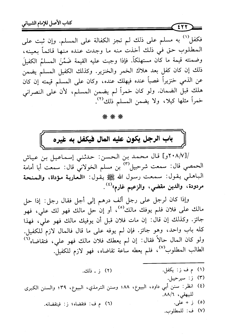 قال محمد بن الحسن: حدثني إسماعيل بن عياش الحمصي قال: سمعمت شرحبيل (¬3) بن مسلم الخولاني قال: سمعت أبا أمامة الباهلي يقول: سمعت رسول الله - صلى الله عليه وسلم - يقول: "العارية مؤداة، والمنحة مردودة، والدين مقضي، والزعيم غارم" (¬4).
