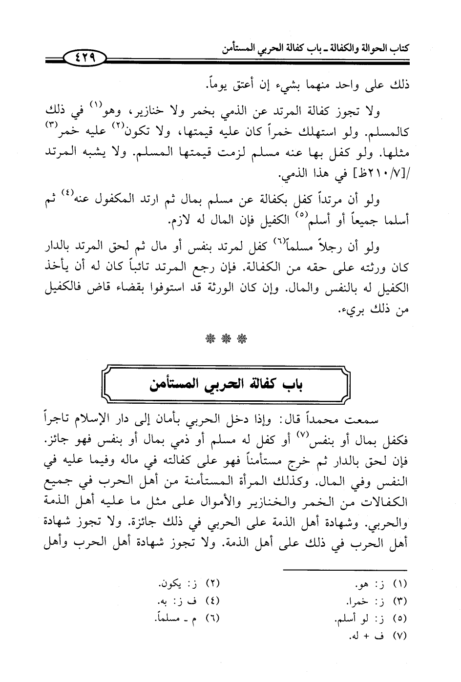 سمعت محمداً قال: وإذا دخل الحربي بأمان إلى دار الإسلام تاجراً فكفل بمال أو بنفس (¬7) أو كفل له مسلم أو ذمي بمال أو بنفس فهو جائز. فإن لحق بالدار ثم خرج مستأمناً فهو على كفالته في ماله وفيما عليه في النفس وفي المال. وكذلك المرأة المستأمنة من أهل الحرب في جميع الكفالات من الخمر والخنازير والأموال على مثل ما عليه أهل الذمة والحربي. وشهادة أهل الذمة على الحربي في ذلك جائزة. ولا تجوز شهادة أهل الحرب في ذلك على أهل الذمة. ولا تجوز شهادة أهل الحرب وأهل