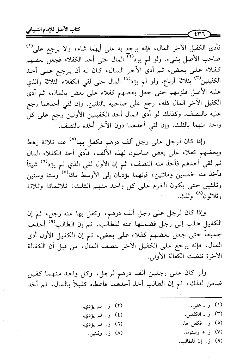 وإذا كان لرجل على رجل ألف درهم فكفل بها (¬5) عنه ثلاثة رهط وبعضهم كفلاء على بعض ضامنون لهذه الألف، فأدى أحد الكفلاء المال ثم لقي أحدهم فأخذ منه النصف، ثم إن الأول لقي الذي لم يؤد (¬6) شيئاً فأخذ منه خمسين ومائتين، فإنهما يؤديان إلى الأوسط مائة (¬7) وستة وستين وثلثين حتى يكون الغرم على كل واحد منهم الثلث: ثلاثمائة وثلاثة وثلاثون (¬8) وثلث.