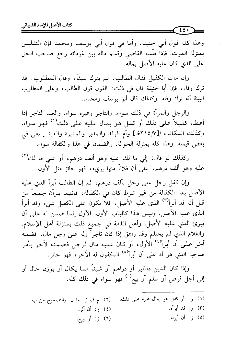 وإن كفل رجل على رجل بألف درهم، ثم إن الطالب أبرأ الذي عليه الأصل بعد الكفالة من غير شرط كان في الكفالة، فإنهما يبرآن جميعاً من قبل أنه قد أبرأ (¬3) الذي عليه الأصل، فلا يكون على الكفيل شيء وقد أبرأ الذي عليه الأصل. وليس هذا كالباب الأول. الأول إنما ضمن له على أن يبرئ الذي عليه الأصل. وأهل الذمة في جميع ذلك بمنزلة أهل الإسلام. والغلام الذي لم يحتلم وقد راهق إذا كان تاجراً وله على رجل مال، فضمنه آخر على أن أبرأ (¬4) الأول، أو كان عليه مال لرجل فضمنه لآخر بأمر صاحبه الذي هو له على أن أبرأ (¬5) المكفول له الآخر، فهو جائز.