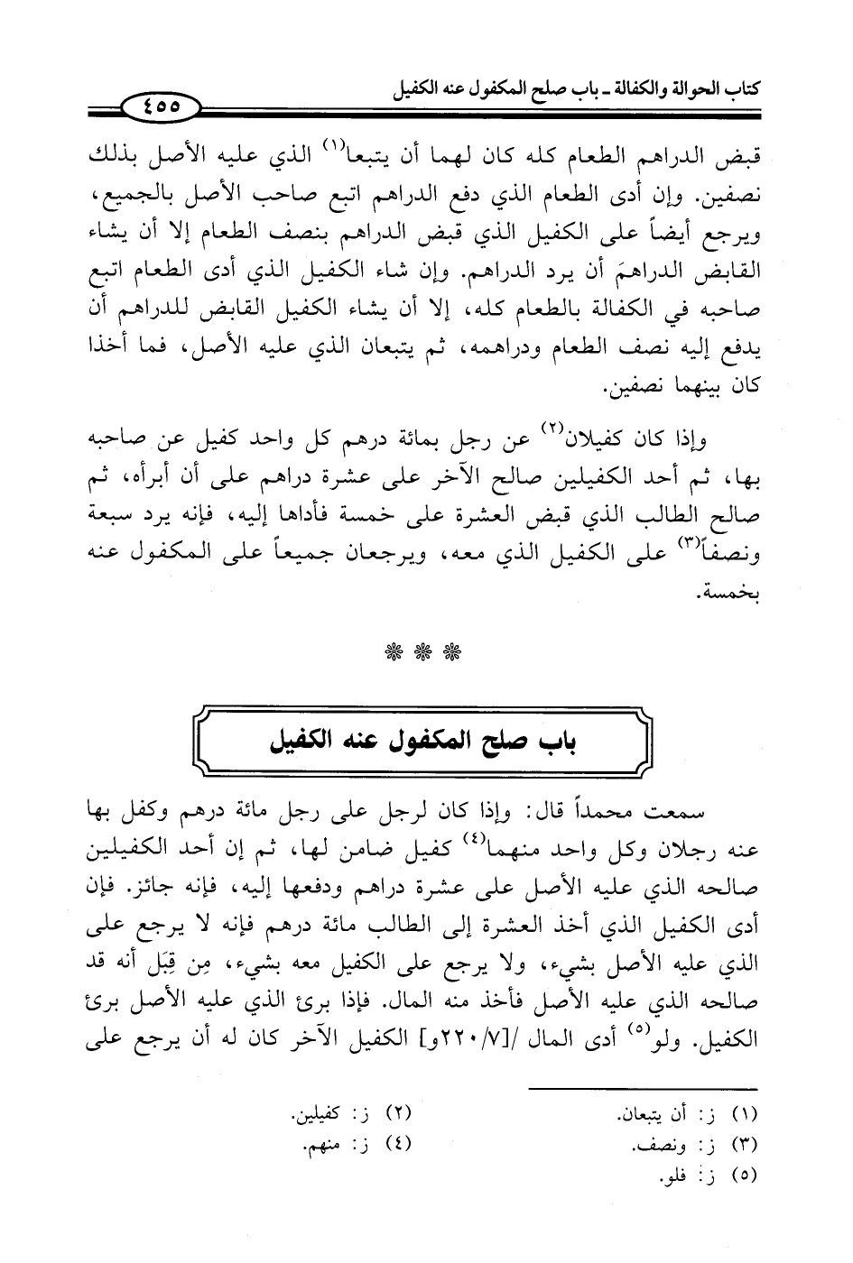 وإذا كان كفيلان (¬2) عن رجل بمائة درهم كل واحد كفيل عن صاحبه بها، ثم أحد الكفيلين صالح الآخر على عشرة دراهم على أن أبرأه، ثم صالح الطالب الذي قبض العشرة على خمسة فأداها إليه، فإنه يرد سبعة ونصفاً (¬3) على الكفيل الذي معه، ويرجعان جميعاً على المكفول عنه بخمسة.