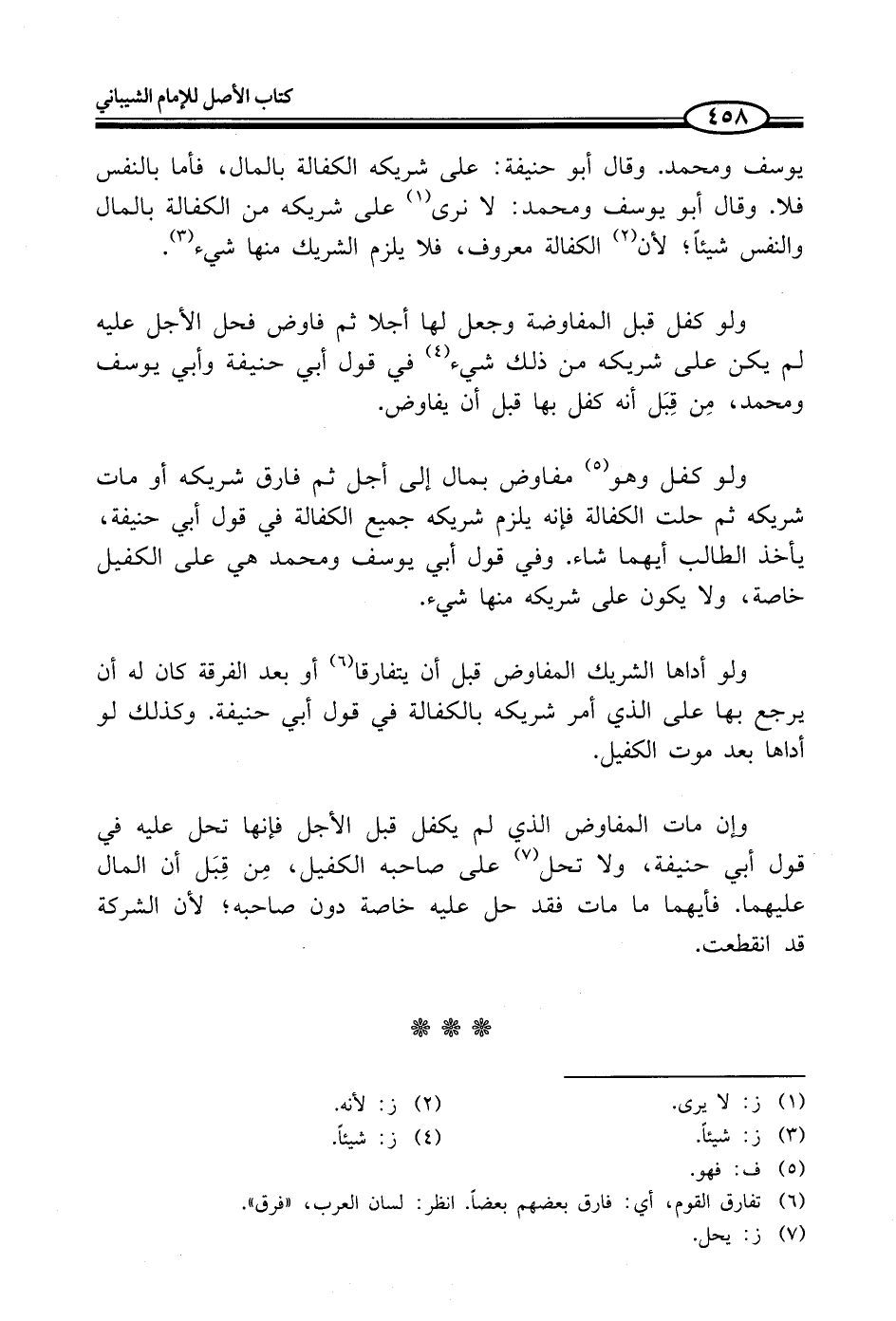 يوسف ومحمد. وقال أَبو حنيفة: على شريكه الكفالة بالمال، فأما بالنفس فلا. وقال أَبو يوسف ومحمد: لا نرى (¬1) على شريكه من الكفالة بالمال والنفس شيئاً؛ لأن (¬2) الكفالة معروف، فلا يلزم الشريك منها شيء (¬3).