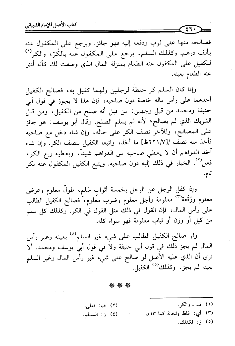 وإذا كفل الرجل عن الرجل بخمسة أثوابٍ سَلَمٍ، طولٌ معلوم وعرض معلوم ورُقْعة (¬3) معلومة وأجل معلوم وضرب معلوم، فصالح الكفيل الطالب على رأس المال، فإن القول في ذلك مثل القول في الكر. وكذلك كل سلم من كيل أو وزن أو ثياب معلومة فهو سواء كله.