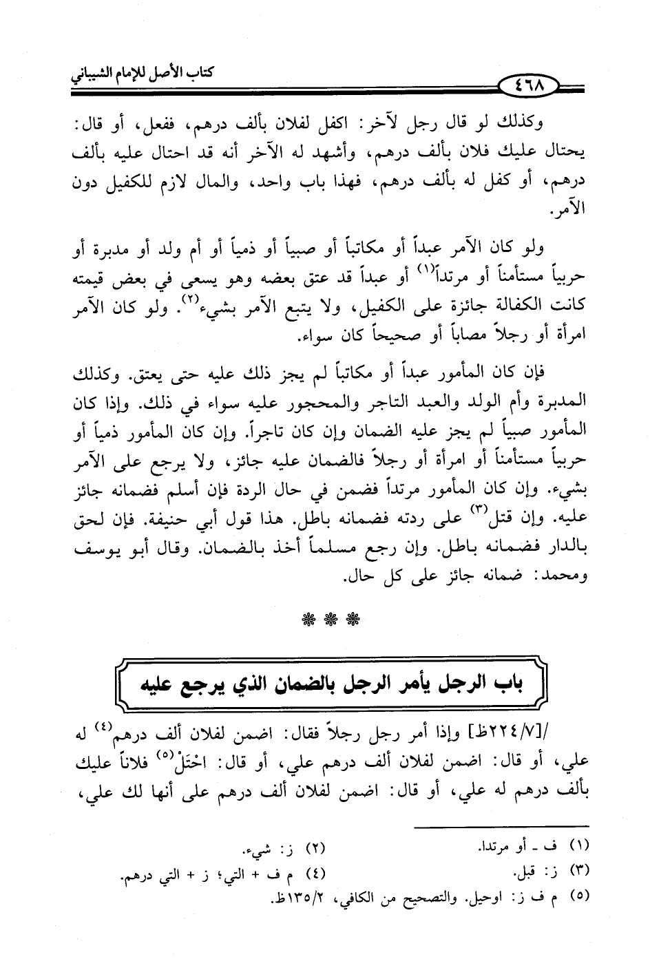 ولو كان الآمر عبداً أو مكاتباً أو صبياً أو ذمياً أو أم ولد أو مدبرة أو حربياً مستأمناً أو مرتداً (¬1) أو عبداً قد عتق بعضه وهو يسعى في بعض قيمته كانت الكفالة جائزة على الكفيل، ولا يتبع الآمر بشيء (¬2). ولو كان الآمر امرأة أو رجلاً مصاباً أو صحيحاً كان سواء.