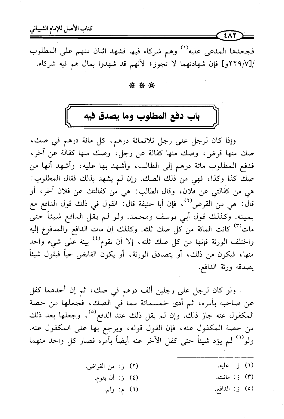 وإذا كان لرجل على رجل ثلاثمائة درهم، كل مائة درهم في صك، صك منها قرض، وصك منها كفالة عن رجل، وصك منها كفالة عن آخر، فدفع المطلوب مائة درهم إلى الطالب، وأشهد بها عليه، وأشهد أنها من صك كذا وكذا، فهي من ذلك الصك. وإن لم يشهد بذلك فقال المطلوب: هي من كفالتي عن فلان، وقال الطالب: هي من كفالتك عن فلان آخر، أو قال: هي من القرض (¬2)، فإن أبا حنيفة قال: القول في ذلك قول الدافع مع يمينه. وكذلك قول أبي يوسف ومحمد. ولو لم يقل الدافع شيئاً حتى مات (¬3) كانت المائة من كل صك ثلثه. وكذلك إن مات الدافع والمدفوع إليه واختلف الورثة فإنها من كل صك ثلثه، إلا أن تقوم (¬4) بينة على شيء واحد منها، فيكون من ذلك، أو يتصادق الورثة، أو يكون القابض حياً فيقول شيئاً يصدقه ورثة الدافع.