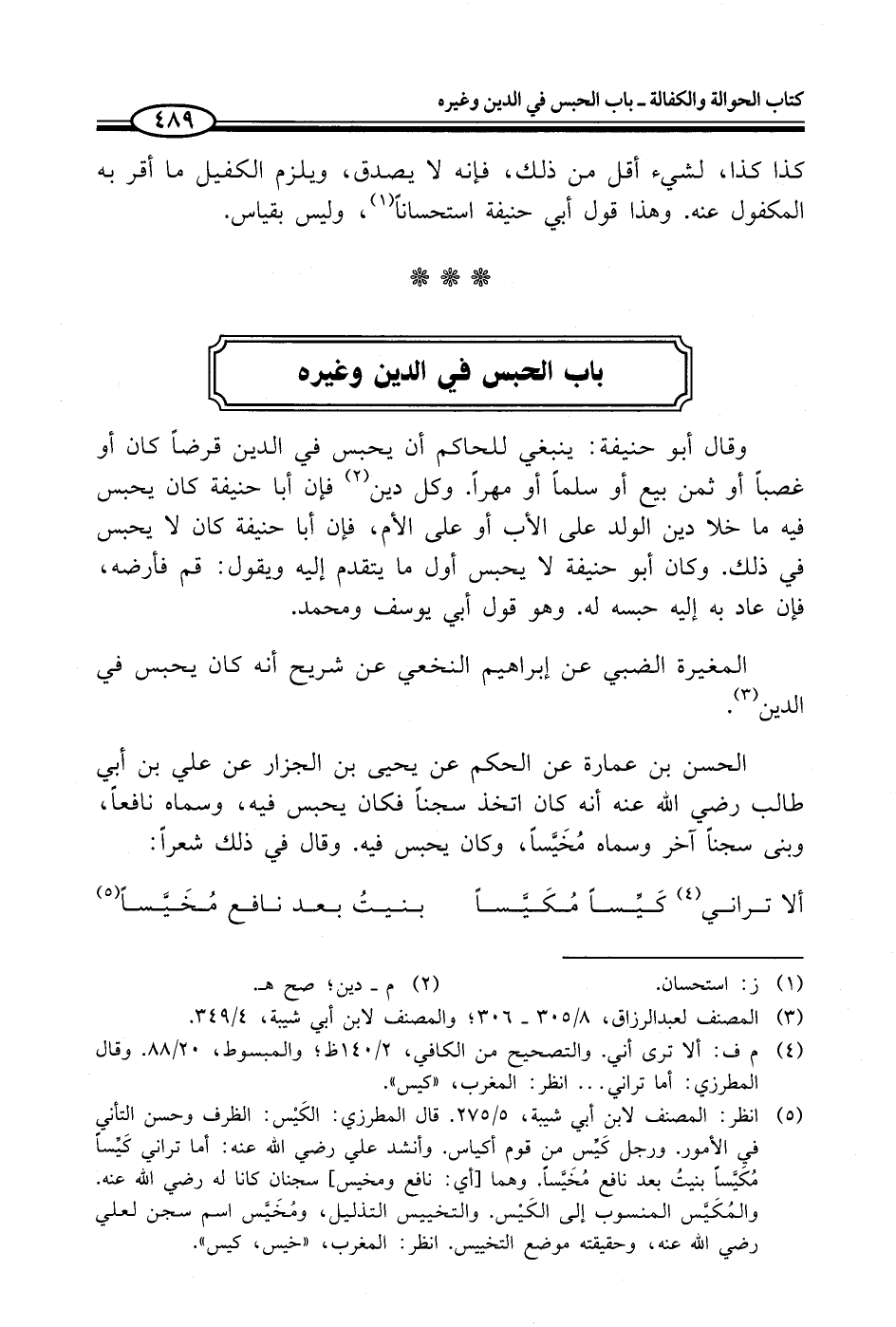 (¬5) انظر: المصنف لابن أبي شيبة، 5/ 275. قال المطرزي: الكَيْس: الظرف وحسن التأني في الأمور. ورجل كَيِّس من قوم أكياس. وأنشد علي - رضي الله عنه -: أما تراني كَيِّساً مُكَيَّساً بنيتُ بعد نافع مُخَيَّساً. وهما [أي: نافع ومخيس] سجنان كانا له - رضي الله عنه - والمُكَيَّس المنسوب إلى الكَيْس. والتخييس التذليل، ومُخَيَّس اسم سجن لعلي - رضي الله عنه -، وحقيقته موضع التخييس. انظر: المغرب، "خيس، كيس".