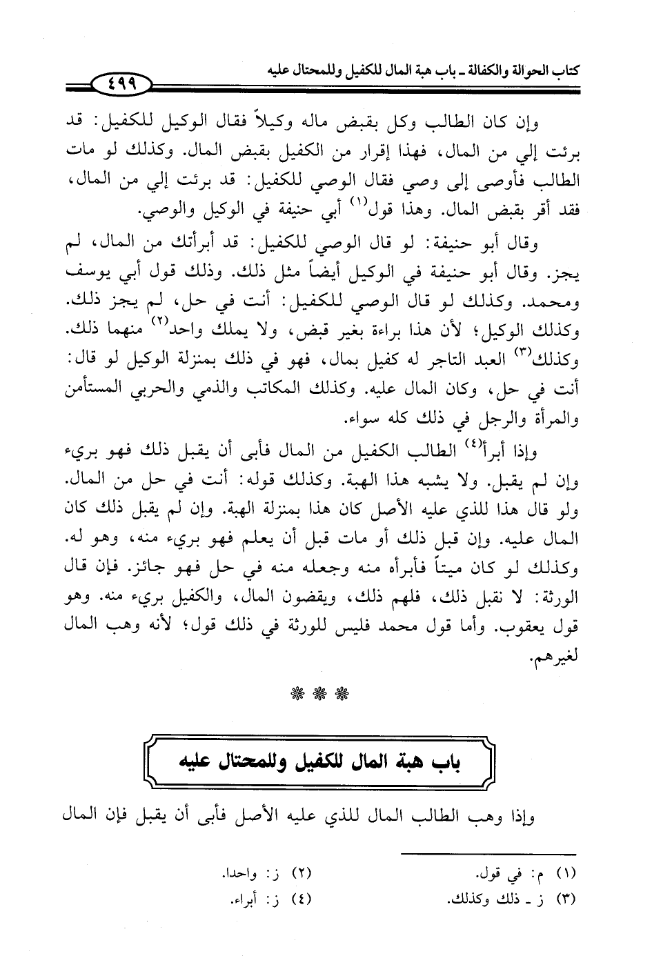 وإذا أبرأ (¬4) الطالب الكفيل من المال فأبى أن يقبل ذلك فهو بريء وإن لم يقبل. ولا يشبه هذا الهبة. وكذلك قوله: أنت في حل من المال. ولو قال هذا للذي عليه الأصل كان هذا بمنزلة الهبة. وإن لم يقبل ذلك كان المال عليه. وإن قبل ذلك أو مات قبل أن يعلم فهو بريء منه، وهو له. وكذلك لو كان ميتاً فأبرأه منه وجعله منه في حل فهو جائز. فإن قال الورثة: لا نقبل ذلك، فلهم ذلك، ويقضون المال، والكفيل بريء منه. وهو قول يعقوب. وأما قول محمد فليس للورثة في ذلك قول؛ لأنه وهب المال لغيرهم.