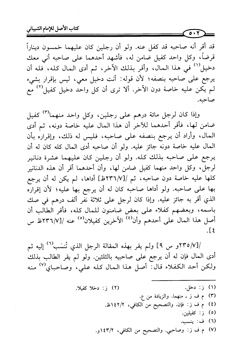 وإذا كان لرجل مائة درهم على رجلين، وكل واحد منهما (¬3) كفيل ضامن لها، فأقر أحدهما للآخر أن هذا المال عليه خاصة دونه، ثم أدى المال، وأراد أن يرجع بنصفه على صاحبه، فليس له ذلك، وإقراره بأن المال عليه خاصة دونه جائز عليه. ولو أن صاحبه أدى المال كله كان له أن يرجع على صاحبه بذلك كله. ولو أن رجلين كان عليهما عشرة دنانير لرجل، وكل واحد منهما كفيل ضامن لها، وأن أحدهما أقر أن هذه الدنانير كلها عليه خاصة دون صاحبه، ثم أداها، لم يكن له أن يرجع بها على صاحبه. ولو أداها صاحبه كان له أن يرجع بها عليه؛ لأن إقراره الذي أقر به جائز عليه. وإذا كان لرجل على ثلاثة نفر ألف درهم في صك باسمه، وبعضهم كفلاء على بعض ضامنون للمال كله، فأقر الطالب أن أصل هذا المال على أحدهم وأن (¬4) الآخرين كفيلان (¬5) عنه.
