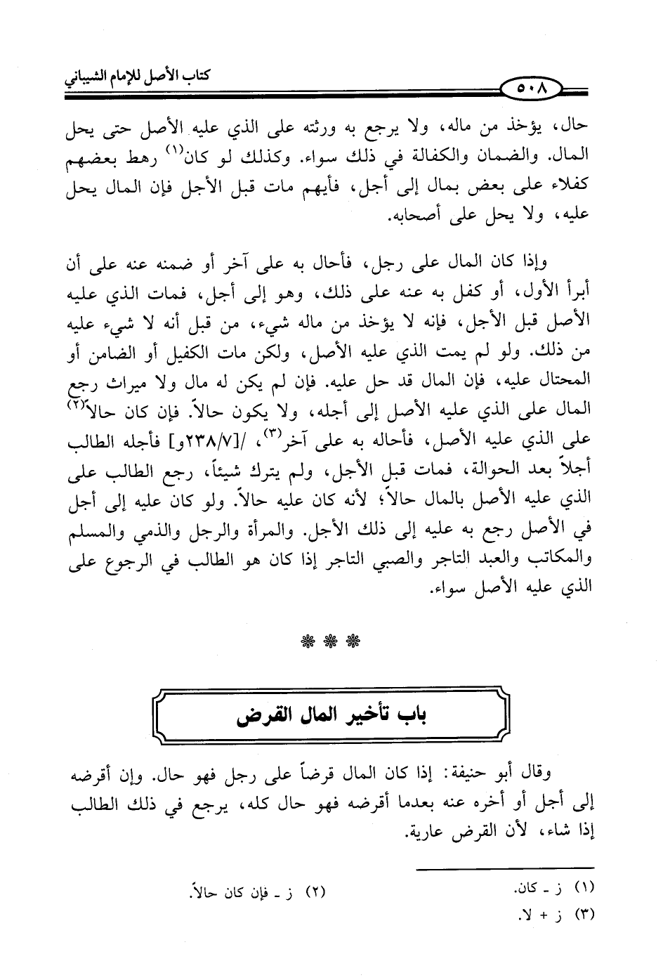 وقال أَبو حنيفة: إذا كان المال قرضاً على رجل فهو حال. وإن أقرضه إلى أجل أو أخره عنه بعدما أقرضه فهو حال كله، يرجع في ذلك الطالب إذا شاء، لأن القرض عارية.