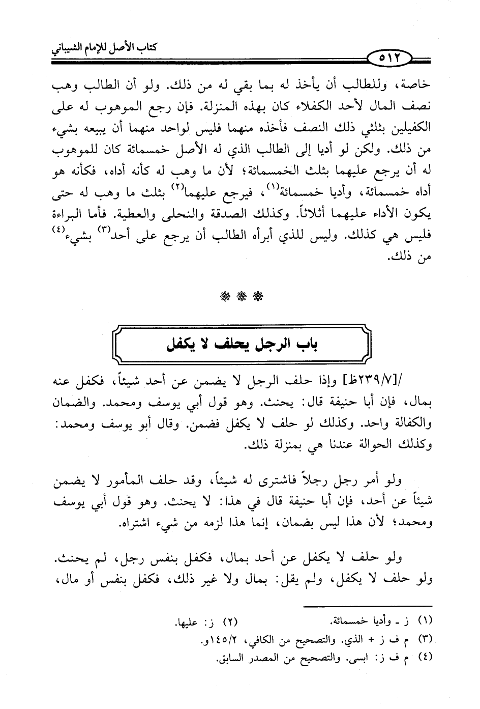 خاصة، وللطالب أن يأخذ له بما بقي له من ذلك. ولو أن الطالب وهب نصف المال لأحد الكفلاء كان بهذه المنزلة. فإن رجع الموهوب له على الكفيلين بثلثي ذلك النصف فأخذه منهما فليس لواحد منهما أن يبيعه بشيء من ذلك. ولكن لو أديا إلى الطالب الذي له الأصل خمسمائة كان للموهوب له أن يرجع عليهما بثلث الخمسمائة؛ لأن ما وهب له كأنه أداه، فكأنه هو أداه خمسمائة، وأديا خمسمائة (¬1)، فيرجع عليهما (¬2) بثلث ما وهب له حتى يكون الأداء عليهما أثلاثاً. وكذلك الصدقة والنحلى والعطية. فأما البراءة فليس هي كذلك. وليس للذي أبرأه الطالب أن يرجع على أحد (¬3) بشيء (¬4) من ذلك.