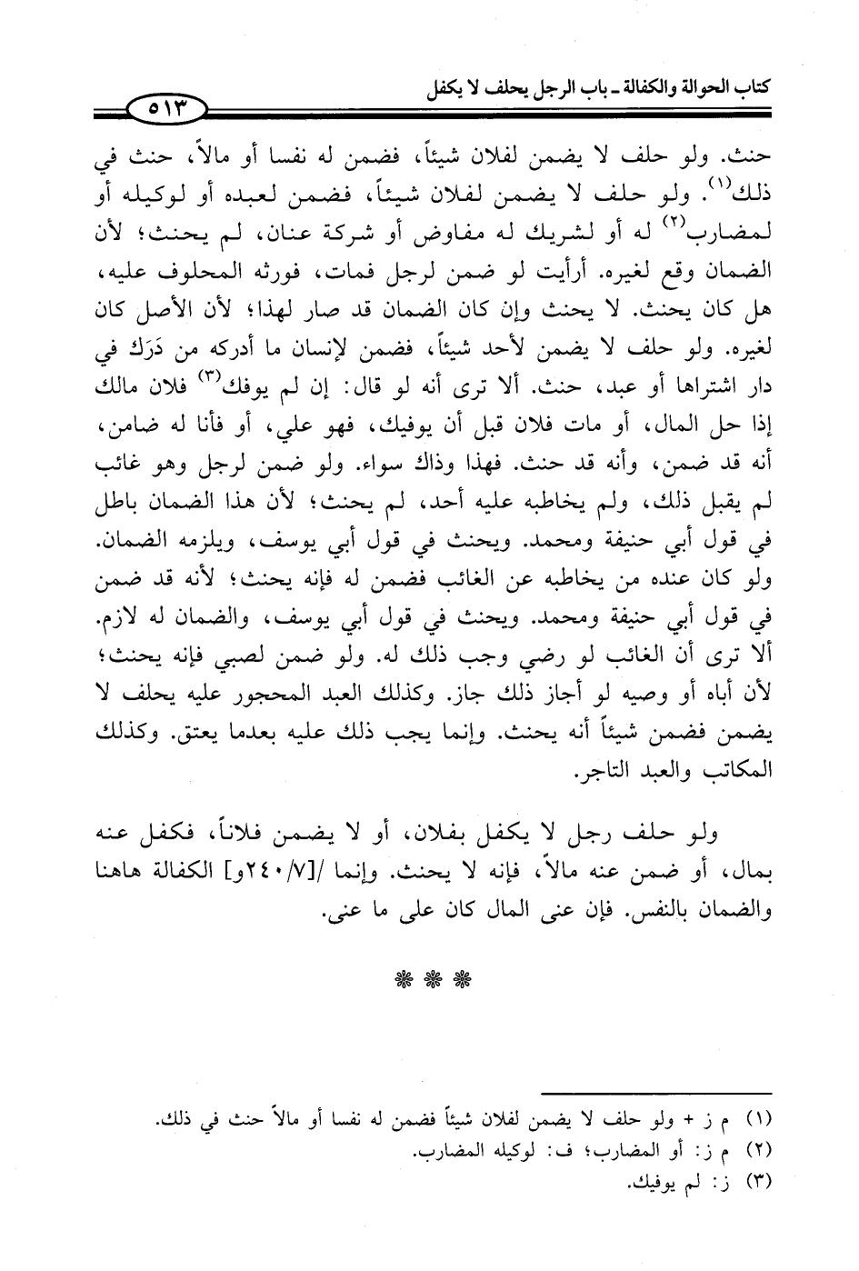 حنث. ولو حلف لا يضمن لفلان شيئاً، فضمن له نفسا أو مالاً، حنث في ذلك (¬1). ولو حلف لا يضمن لفلان شيئاً، فضمن لعبده أو لوكيله أو لمضارب (¬2) له أو لشريك له مفاوض أو شركة عنان، لم يحنث؛ لأن الضمان وقع لغيره. أرأيت لو ضمن لرجل فمات، فورثه المحلوف عليه، هل كان يحنث. لا يحنث وإن كان الضمان قد صار لهذا؛ لأن الأصل كان لغيره. ولو حلف لا يضمن لأحد شيئاً، فضمن لإنسان ما أدركه من دَرَك في دار اشتراها أو عبد، حنث. ألا ترى أنه لو قال: إن لم يوفك (¬3) فلان مالك إذا حل المال، أو مات فلان قبل أن يوفيك، فهو علي، أو فأنا له ضامن، أنه قد ضمن، وأنه قد حنث. فهذا وذاك سواء. ولو ضمن لرجل وهو غائب لم يقبل ذلك، ولم يخاطبه عليه أحد، لم يحنث؛ لأن هذا الضمان باطل في قول أبي حنيفة ومحمد. ويحنث في قول أبي يوسف، ويلزمه الضمان. ولو كان عنده من يخاطبه عن الغائب فضمن له فإنه يحنث، لأنه قد ضمن في قول أبي حنيفة ومحمد. ويحنث في قول أبي يوسف، والضمان له لازم. ألا ترى أن الغائب لو رضي وجب ذلك له. ولو ضمن لصبي فإنه يحنث؛ لأن أباه أو وصيه لو أجاز ذلك جاز. وكذلك العبد المحجور عليه يحلف لا يضمن فضمن شيئاً أنه يحنث. وإنما يجب ذلك عليه بعدما يعتق. وكذلك المكاتب والعبد التاجر.