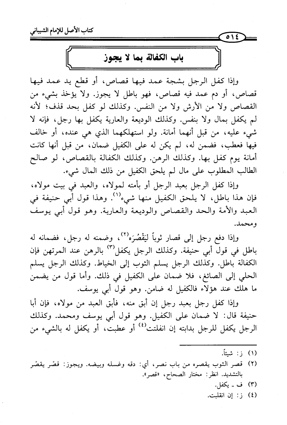 وإذا دفع رجل إلى قصار ثوباً ليَقْصُرَه (¬2)، وضمنه له رجل، فضمانه له باطل في قول أبي حنيفة. وكذلك الرجل يكفل (¬3) بالرهن عند المرتهن فإن الكفالة باطل. وكذلك الرجل يسلم الثوب إلى الخياط. وكذلك الرجل يسلم الحلي إلى الصائغ، فلا ضمان على الكفيل في ذلك. وأما قول من يضمن ما هلك عند هؤلاء فالكفيل له ضامن. وهو قول أبي يوسف.