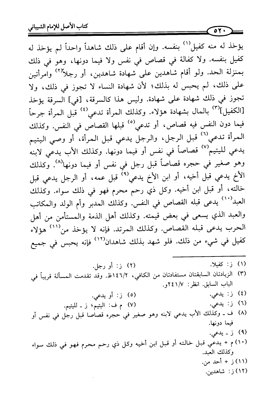 يؤخذ له منه كفيل (¬1) بنفسه. وإن أقام على ذلك شاهداً واحداً لم يؤخذ له كفيل بنفسه. ولا كفالة في قصاص في نفس ولا فيما دونها، وهو في ذلك بمنزلة الحد. ولو أقام شاهدين على شهادة شاهدين، أو رجلاً (¬2) وامرأتين على ذلك، لم يحبس له بذلك؛ لأن شهادة النساء لا تجوز في ذلك، ولا تجوز في ذلك شهادة على شهادة. وليس هذا كالسرقة، [في] السرقة يؤخذ [الكفيل] (¬3) بالمال بشهادة هؤلاء. وكذلك المرأة تدعي (¬4) قبل المرأة جرحاً فيما دون النفس فيه قصاص، أو تدعي (¬5) قبلها القصاص في النفس. وكذلك المرأة تدعي (¬6) قبل الرجل، والرجل يدعي قبل المرأة، أو وصي اليتيم يدعي لليتيم (¬7) قصاصاً في نفس أو فيما دونها. وكذلك الأب يدعي لابنه وهو صغير في حجره قصاصاً قبل رجل في نفس أو فيما دونها (¬8). وكذلك الأخ يدعي قبل أخيه، أو ابن الأخ يدعي (¬9) قبل عمه، أو الرجل يدعي قبل خالته، أو قبل ابن أخيه. وكل ذي رحم محرم فهو في ذلك سواء. وكذلك العبد (¬10) يدعى قبله القصاص في النفس. وكذلك المدبر وأم الولد والمكاتب والعبد الذي يسعى في بعض قيمته. وكذلك أهل الذمة والمستأمن من أهل الحرب يدعى قبله القصاص. وكذلك المرتد. فإنه لا يؤخذ من (¬11) هؤلاء كفيل في شيء من ذلك. فلو شهد بذلك شاهدان (¬12) فإنه يحبس في جميع