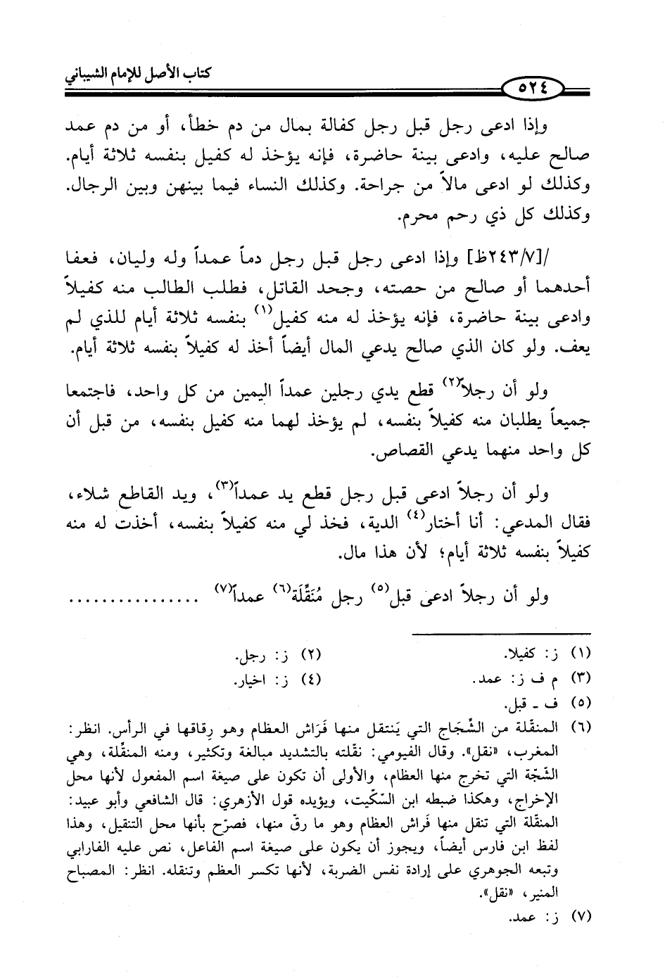 ولو أن رجلاً ادعى قبل رجل قطع يد عمداً (¬3)، ويد القاطع شلاء، فقال المدعى: أنا أختار (¬4) الدية، فخذ لى منه كفيلاً بنفسه، أخذت له منه كفيلاً بنفسه ثلاثة أيام؛ لأن هذا مال.