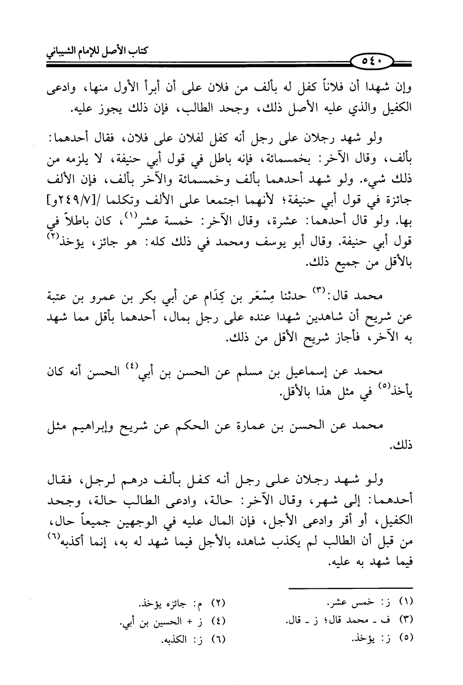 محمد قال: (¬3) حدثنا مِسْعَر بن كِدَام عن أبي بكر بن عمرو بن عتبة عن شريح أن شاهدين شهدا عنده على رجل بمال، أحدهما بأقل مما شهد به الآخر، فأجاز شريح الأقل من ذلك.