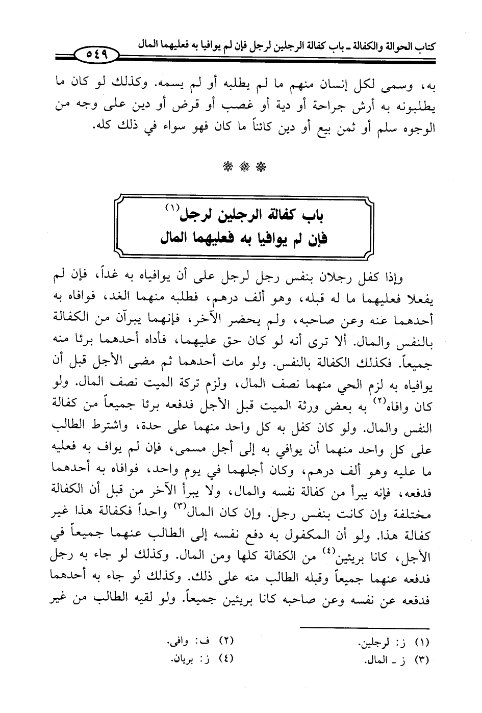 وإذا كفل رجلان بنفس رجل لرجل على أن يوافياه به غداً، فإن لم يفعلا فعليهما ما له قبله، وهو ألف درهم، فطلبه منهما الغد، فوافاه به أحدهما عنه وعن صاحبه، ولم يحضر الآخر، فإنهما يبرآن من الكفالة بالنفس والمال. ألا ترى أنه لو كان حق عليهما، فأداه أحدهما برئا منه جميعاً. فكذلك الكفالة بالنفس. ولو مات أحدهما ثم مضى الأجل قبل أن يوافياه به لزم الحي منهما نصف المال، ولزم تركة الميت نصف المال. ولو كان وافاه (¬2) به بعض ورثة الميت قبل الأجل فدفعه برئا جميعاً من كفالة النفس والمال. ولو كان كفل به كل واحد منهما على حدة، واشترط الطالب على كل واحد منهما أن يوافي به إلى أجل مسمى، فإن لم يواف به فعليه ما عليه وهو ألف درهم، وكان أجلهما في يوم واحد، فوافاه به أحدهما فدفعه، فإنه يبرأ من كفالة نفسه والمال، ولا يبرأ الآخر من قبل أن الكفالة مختلفة وإن كانت بنفس رجل. وإن كان المال (¬3) واحداً فكفالة هذا غير كفالة هذا. ولو أن المكفول به دفع نفسه إلى الطالب عنهما جميعاً في الأجل، كانا بريئين (¬4) من الكفالة كلها ومن المال. وكذلك لو جاء به رجل فدفعه عنهما جميعاً وقبله الطالب منه على ذلك. وكذلك لو جاء به أحدهما فدفعه عن نفسه وعن صاحبه كانا بريئين جميعاً. ولو لقيه الطالب من غير