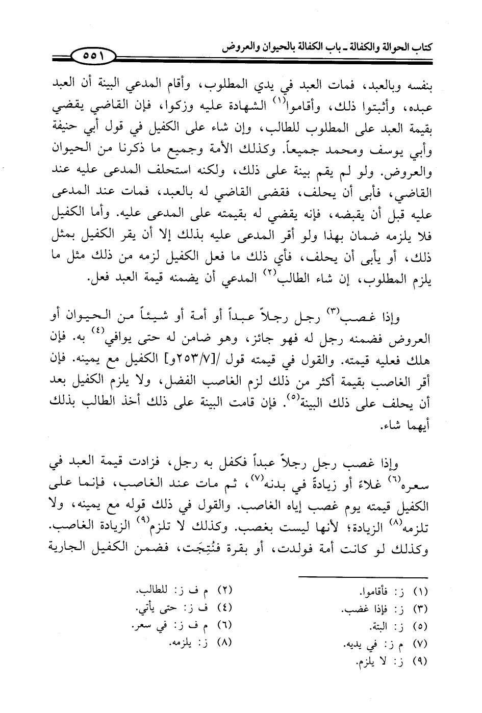 وإذا غصب (¬3) رجل رجلاً عبداً أو أمة أو شيئاً من الحيوان أو العروض فضمنه رجل له فهو جائز، وهو ضامن له حتى يوافي (¬4) به. فإن هلك فعليه قيمته. والقول في قيمته قول الكفيل مع يمينه. فإن أقر الغاصب بقيمة أكثر من ذلك لزم الغاصب الفضل، ولا يلزم الكفيل بعد أن يحلف على ذلك البينة (¬5) فإن قامت البينة على ذلك أخذ الطالب بذلك أيهما شاء.