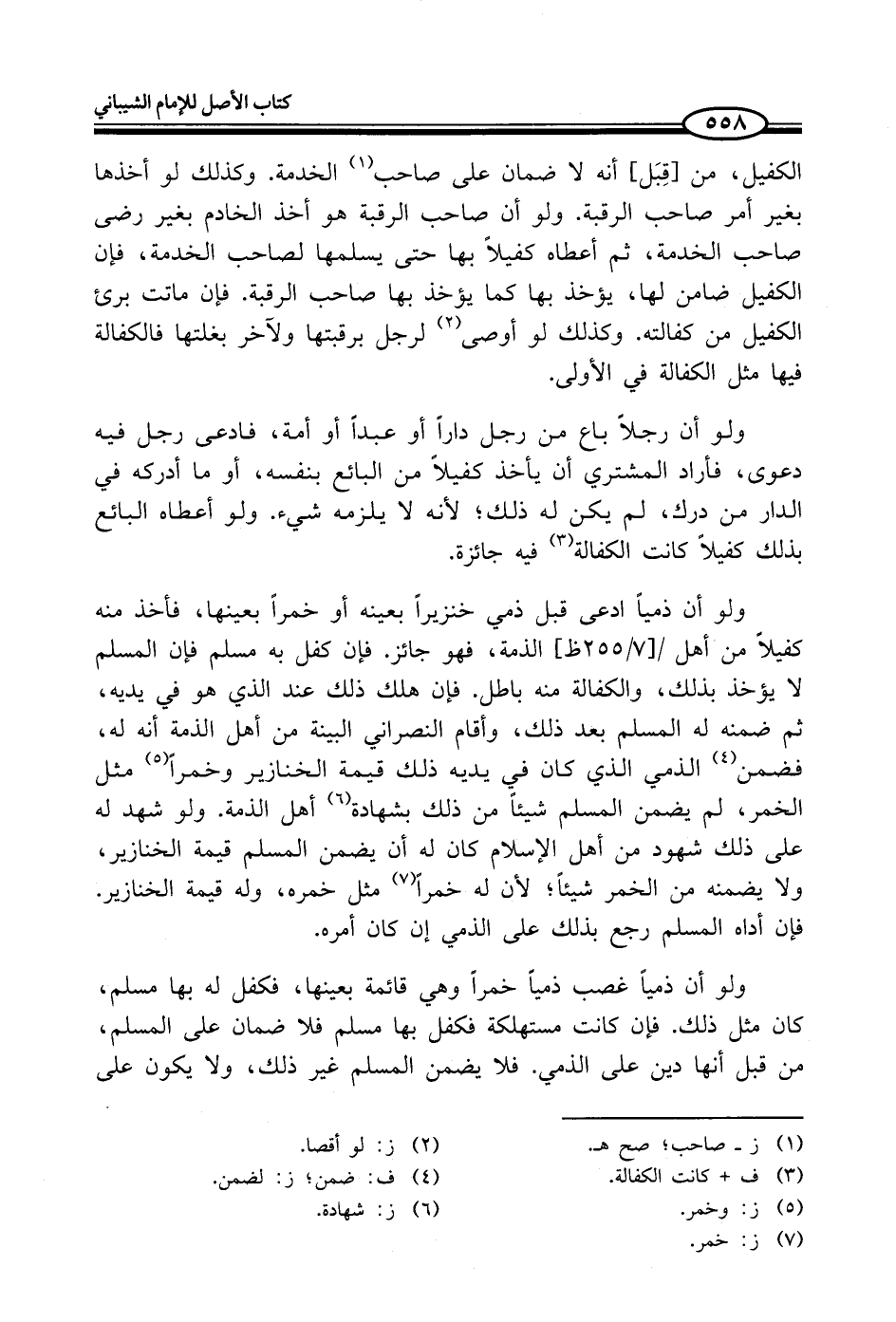 ولو أن ذمياً ادعى قبل ذمي خنزيراً بعينه أو خمراً بعينها، فأخذ منه كفيلاً من أهل الذمة، فهو جائز. فإن كفل به مسلم فإن المسلم لا يؤخذ بذلك، والكفالة منه باطل. فإن هلك ذلك عند الذي هو في يديه، ثم ضمنه له المسلم بعد ذلك، وأقام النصراني البينة من أهل الذمة أنه له، فضمن (¬4) الذمي الذي كان في يديه ذلك قيمة الخنازير وخمراً (¬5) مثل الخمر، لم يضمن المسلم شيئاً من ذلك بشهادة (¬6) أهل الذمة. ولو شهد له على ذلك شهود من أهل الإسلام كان له أن يضمن المسلم قيمة الخنازير، ولا يضمنه من الخمر شيئاً؛ لأن له خمراً (¬7) مثل خمره، وله قيمة الخنازير. فإن أداه المسلم رجع بذلك على الذمي إن كان أمره.