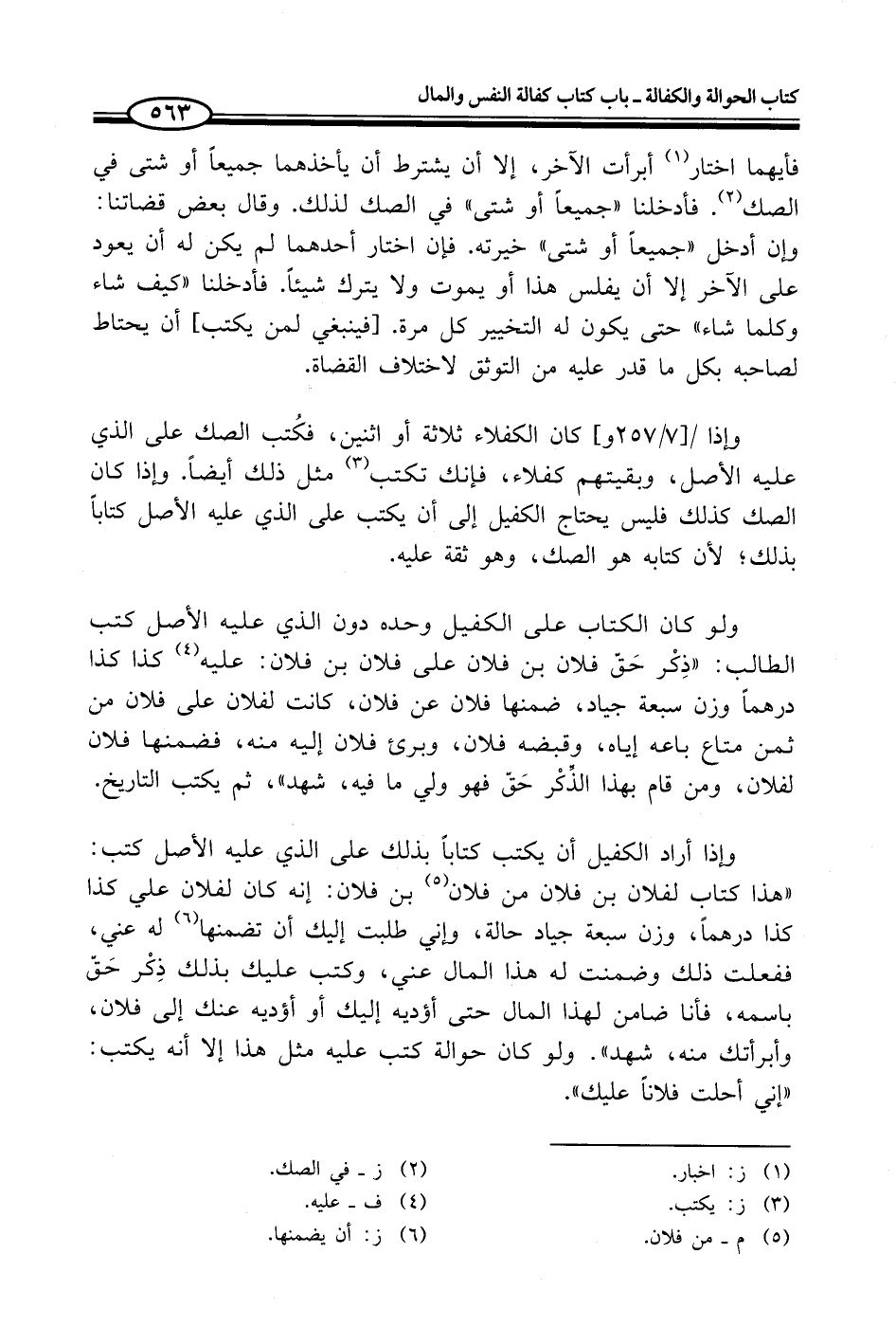 وإذا أراد الكفيل أن يكتب كتاباً بذلك على الذي عليه الأصل كتب: "هذا كتاب لفلان بن فلان من فلان (¬5) بن فلان: إنه كان لفلان علي كذا كذا درهماً، وزن سبعة جياد حالة، وإني طلبت إليك أن تضمنها (¬6) له عني، ففعلت ذلك وضمنت له هذا المال عني، وكتب عليك بذلك ذِكْر حَقّ باسمه، فأنا ضامن لهذا المال حتى أؤديه إليك أو أؤديه عنك إلى فلان، وأبرأتك منه، شهد". ولو كان حوالة كتب عليه مثل هذا إلا أنه يكتب: "إني أحلت فلاناً عليك".