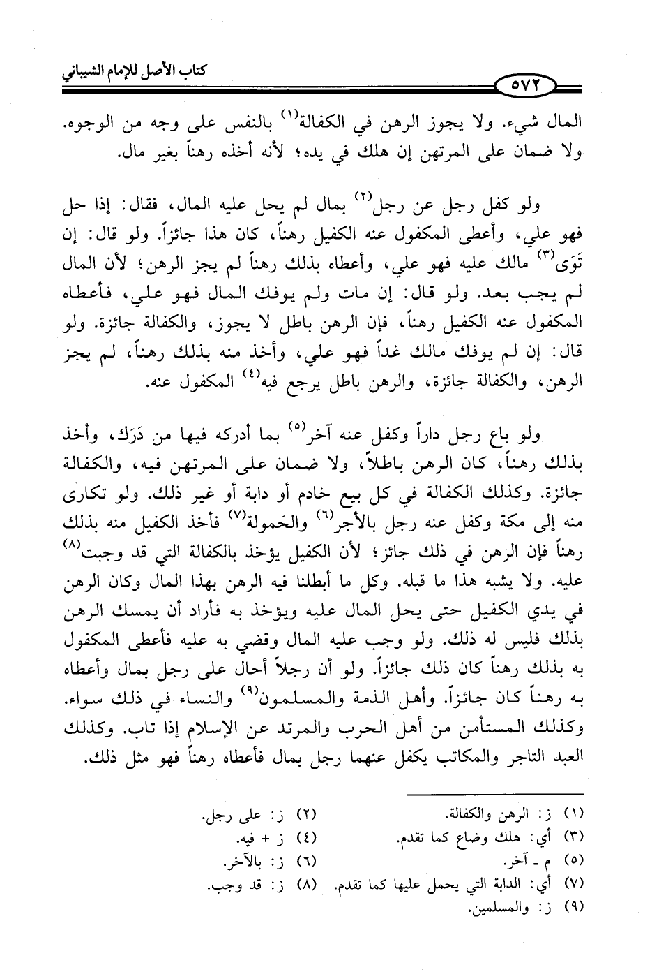 ولو باع رجل داراً وكفل عنه آخر (¬5) بما أدركه فيها من دَرَك، وأخذ بذلك رهناً، كان الرهن باطلاً، ولا ضمان على المرتهن فيه، والكفالة جائزة. وكذلك الكفالة في كل بيع خادم أو دابة أو غير ذلك. ولو تكارى منه إلى مكة وكفل عنه رجل بالأجر (¬6) والحَمولة (¬7) فأخذ الكفيل منه بذلك رهناً فإن الرهن في ذلك جائز؛ لأن الكفيل يؤخذ بالكفالة التي قد وجبت (¬8) عليه. ولا يشبه هذا ما قبله. وكل ما أبطلنا فيه الرهن بهذا المال وكان الرهن في يدي الكفيل حتى يحل المال عليه ويؤخذ به فأراد أن يمسك الرهن بذلك فليس له ذلك. ولو وجب عليه المال وقضي به عليه فأعطى المكفول به بذلك رهناً كان ذلك جائزاً. ولو أن رجلاً أحال على رجل بمال وأعطاه به رهناً كان جائزاً. وأهل الذمة والمسلمون (¬9) والنساء في ذلك سواء. وكذلك المستأمن من أهل الحرب والمرتد عن الإسلام إذا تاب. وكذلك العبد التاجر والمكاتب يكفل عنهما رجل بمال فأعطاه رهناً فهو مثل ذلك.