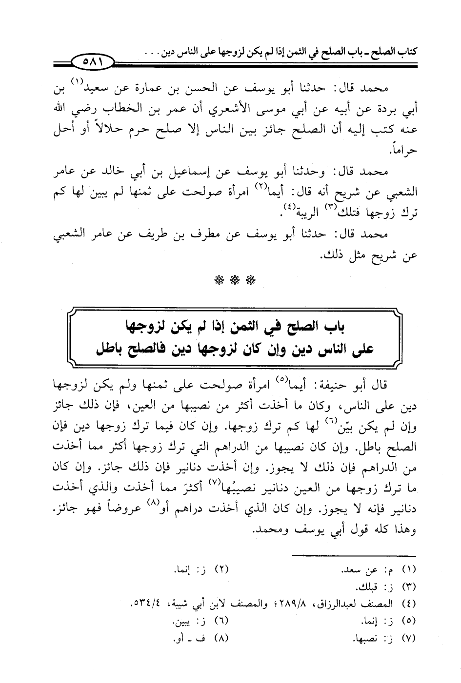 قال أبو حنيفة: أيما (¬5) امرأة صولحت على ثمنها ولم يكن لزوجها دين على الناس، وكان ما أخذت أكثر من نصيبها من العين، فإن ذلك جائز وإن لم يكن بيّن (¬6) لها كم ترك زوجها. وإن كان فيما ترك زوجها دين فإن الصلح باطل. وإن كان نصيبها من الدراهم التي ترك زوجها أكثر مما أخذت من الدراهم فإن ذلك لا يجوز. وإن أخذت دنانير فإن ذلك جائز. وإن كان ما ترك زوجها من العين دنانير نصيبُها (¬7) أكثرَ مما أخذت والذي أخذت دنانير فإنه لا يجوز. وإن كان الذي أخذت دواهم أو (¬8) عروضاً فهو جائز. وهذا كله قول أبي يوسف ومحمد.