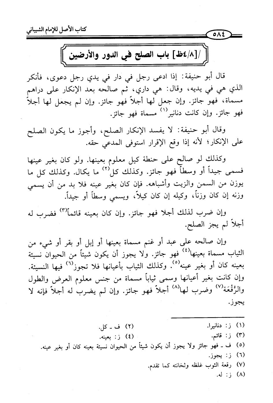 وإن صالحه على عبد أو غنم مسماة بعينها أو إبل أو بقر أو شيء من الثياب مسماة بعينها (¬4) فهو جائز. ولا يجوز أن يكون شيئاً من الحيوان نسيئة بعينه كان أو بغير عينه (¬5). وكذلك الثياب بأعيانها فلا تجوز (¬6) فيها النسيئة. وإن كانت بغير أعيانها وسمى ثياباً مسماة من جنس معلوم العرض والطول والرُّقْعَة (¬7) وضرب لها (¬8) أجلاً فهو جائز. وإن لم يضرب له أجلاً فإنه لا يجوز.