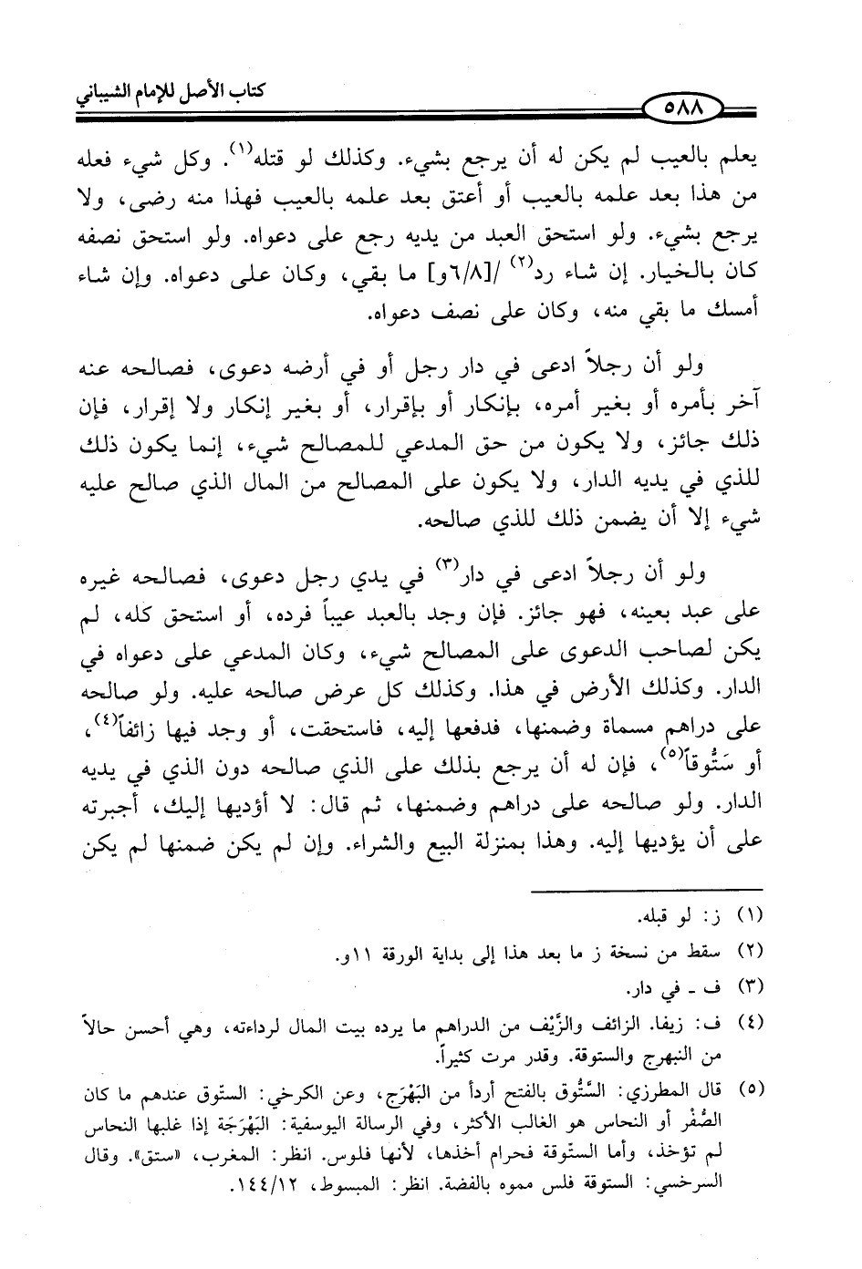 ولو أن رجلاً ادعى في دار (¬3) في يدي رجل دعوى، فصالحه غيره على عبد بعينه، فهو جائز. فإن وجد بالعبد عيباً فرده، أو استحق كله، لم يكن لصاحب الدعوى على المصالح شيء، وكان المدعي على دعواه في الدار. وكذلك الأرض في هذا. وكذلك كل عرض صالحه عليه. ولو صالحه على دراهم مسماة وضمنها، فدفعها إليه، فاستحقت، أو وجد فيها زائفاً (¬4)، أو سَتُّوقاً (¬5)، فإن له أن يرجع بذلك على الذي صالحه دون الذي في يديه الدار. ولو صالحه على دراهم وضمنها، ثم قال: لا أؤديها إليك، أجبرته على أن يؤديها إليه. وهذا بمنزلة البيع والشراء. وإن لم يكن ضمنها لم يكن
