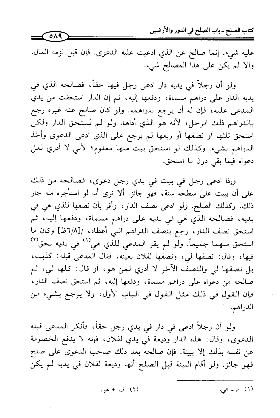 وإذا ادعى رجل في بيت في يدي رجل دعوى، فصالحه من ذلك على أن يبيت على سطحه سنة، فهو جائز. ألا ترى أنه لو استأجره منه جاز ذلك. وكذلك الصلح. ولو ادعى نصف الدار، وأقر بأن نصفها للذي هي في يديه، فصالحه الذي هي في يديه على دراهم مسماة، ودفعها إليه، ثم استحق نصف الدار، رجع بنصف الدراهم التي أعطاه، وكان ما استحق منهما جميعاً. ولو لم يقر المدعي للذي هي (¬1) في يديه بحق (¬2) فيها، وقال: نصفها لي، ونصفها لفلان بعينه، فقال المدعى قبله: كذبت، بل نصفها لي والنصف الآخر لا أدري لمن هو، أو قال: كلها لي، ثم صالحه من دعواه على دراهم مسماة، ودفعها إليه، ثم استحق نصف الدار، فإن القول في ذلك مثل القول في الباب الأول، ولا يرجع بشيء من الدراهم.