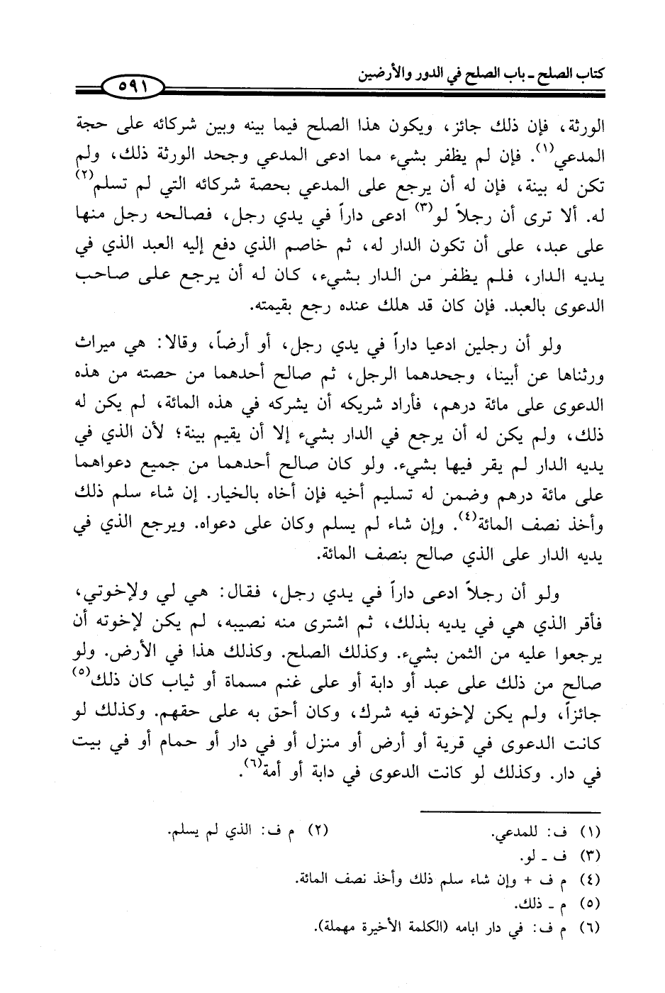ولو أن رجلين ادعيا داراً في يدي رجل، أو أرضاً، وقالا: هي ميراث ورثناها عن أبينا، وجحدهما الرجل، ثم صالح أحدهما من حصته من هذه الدعوى على مائة درهم، فأراد شريكه أن يشركه في هذه المائة، لم يكن له ذلك، ولم يكن له أن يرجع في الدار بشيء إلا أن يقيم بينة؛ لأن الذي في يديه الدار لم يقر فيها بشيء. ولو كان صالح أحدهما من جميع دعواهما على مائة درهم وضمن له تسليم أخيه فإن أخاه بالخيار. إن شاء سلم ذلك وأخذ نصف المائة (¬4). وإن شاء لم يسلم وكان على دعواه. ويرجع الذي في يديه الدار على الذي صالح بنصف المائة.