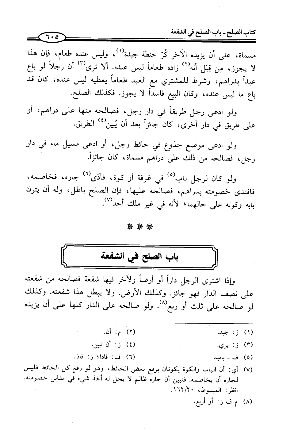 ولو ادعى رجل طريقاً في دار رجل، فصالحه منها على دراهم، أو على طريق في دار أخرى، كان جائزاً بعد أن يُبين (¬4) الطريق.