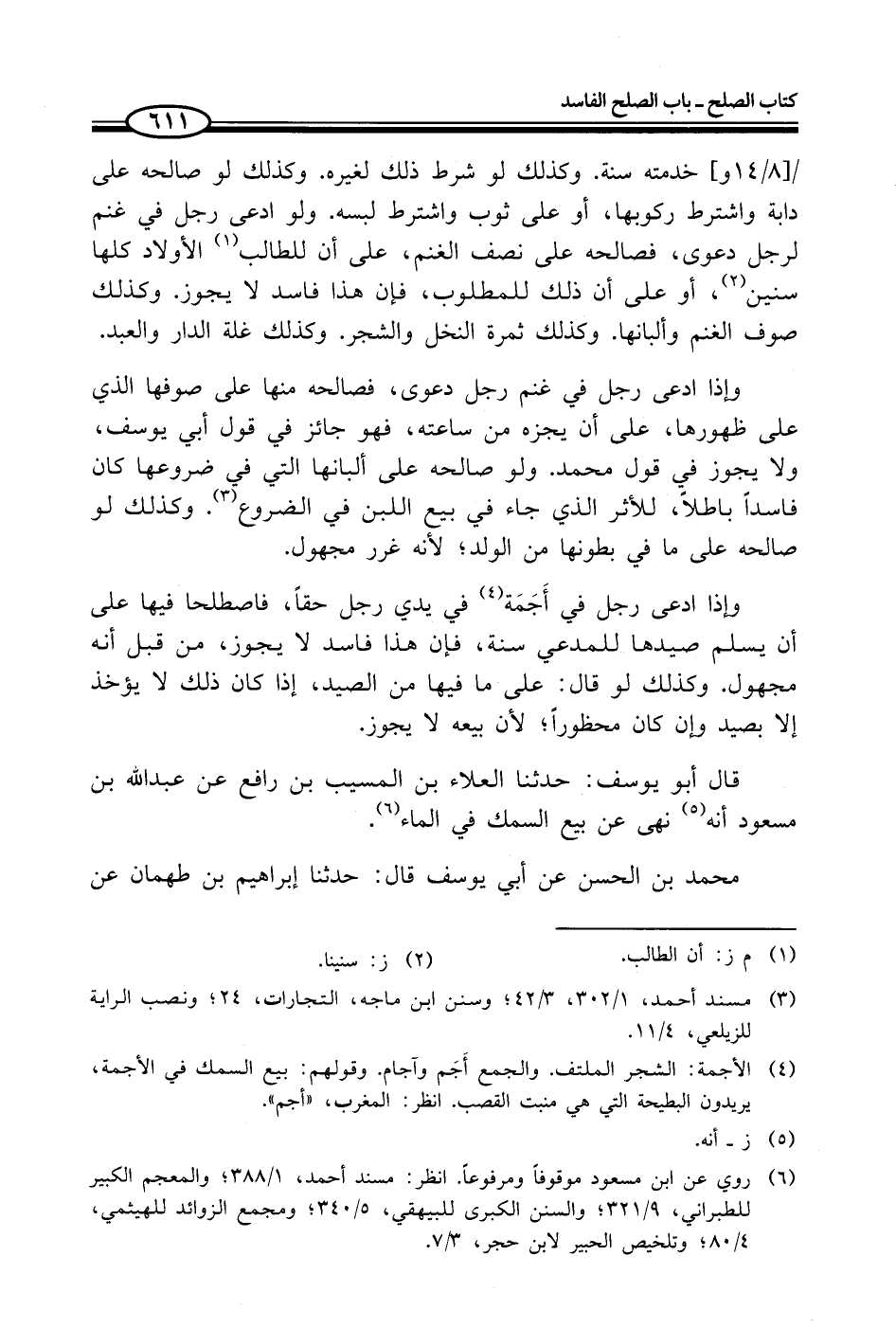 خدمته سنة. وكذلك لو شرط ذلك لغيره. وكذلك لو صالحه على دابة واشترط ركوبها، أو على ثوب واشترط لبسه. ولو ادعى رجل في غنم لرجل دعوى، فصالحه على نصف الغنم، على أن للطالب (¬1) الأولاد كلها سنين (¬2)، أو على أن ذلك للمطلوب، فإن هذا فاسد لا يجوز. وكذلك صوف الغنم وألبانها. وكذلك ثمرة النخل والشجر. وكذلك غلة الدار والعبد.