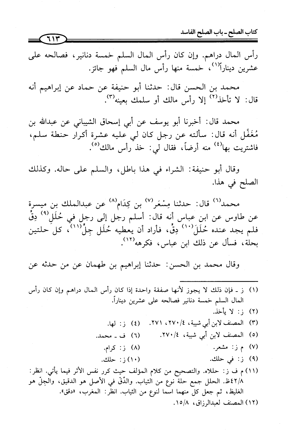 (¬1) ز - فإن ذلك لا يجوز لأنها صفقة واحدة إذا كان رأس المال دراهم وإن كان رأس المال السلم خمسة دنانير فصالحه على عشرين ديناراً.
