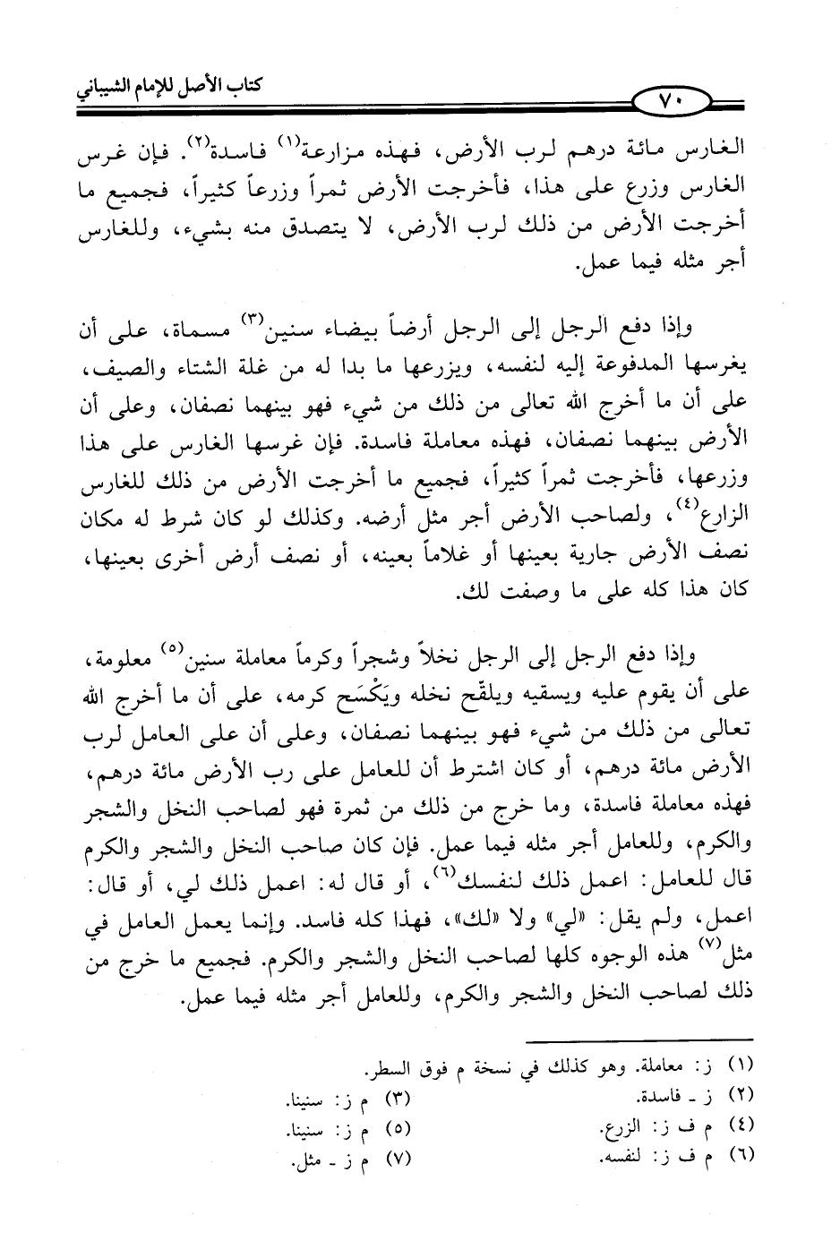 وإذا دفع الرجل إلى الرجل نخلاً وشجراً وكرماً معاملة سنين (¬5) معلومة، على أن يقوم عليه ويسقيه ويلقّح نخله ويَكْسَح كرمه، على أن ما أخرج الله تعالى من ذلك من شيء فهو بينهما نصفان، وعلى أن على العامل لرب الأرض مائة درهم، أو كان اشترط أن للعامل على رب الأرض مائة درهم، فهذه معاملة فاسدة، وما خرج من ذلك من ثمرة فهو لصاحب النخل والشجر والكرم، وللعامل أجر مثله فيما عمل. فإن كان صاحب النخل والشجر والكرم قال للعامل: اعمل ذلك لنفسك (¬6)، أو قال له: اعمل ذلك في، أو قال: اعمل، ولم يقل: "لي" ولا "لك"، فهذا كله فاسد. وإنما يعمل العامل في مثل (¬7) هذه الوجوه كلها لصاحب النخل والشجر والكرم. فجميع ما خرج من ذلك لصاحب النخل والشجر والكرم، وللعامل أجر مثله فيما عمل.