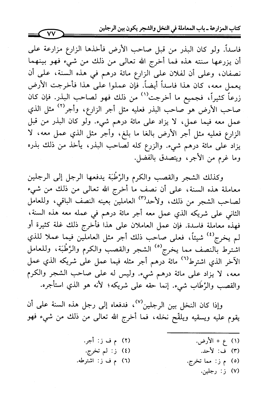 وكذلك الشجر والقصب والكرم والرَّطْبَة يدفعها الرجل إلى الرجلين معاملة هذه السنة، على أن نصف ما أخرج الله تعالى من ذلك من شيء لصاحب الشجر من ذلك، ولأحد (¬3) العاملين بعينه النصف الباقي، وللعامل الثاني على شريكه الذي عمل معه أجر مائة درهم في عمله معه هذه السنة، فهذه معاملة فاسدة. فإن عمل العاملان على هذا فأخرج ذلك غلة كثيرة أو لم يخرج (¬4) شيئاً، فعلى صاحب ذلك أجر مثل العاملين فيما عملا للذي اشترط بالنصف مما يخرج (¬5) الشجر والقصب والكرم والرَّطْبَة، وللعامل الآخر الذي اشترط (¬6) مائة درهم أجر مثله فيما عمل على شريكه الذي عمل معه، لا يزاد على مائة درهم شيء. وليس له على صاحب الشجر والكرم والقصب والرِّطَاب شيء. إنما حقه على شريكه؛ لأنه هو الذي استأجره.