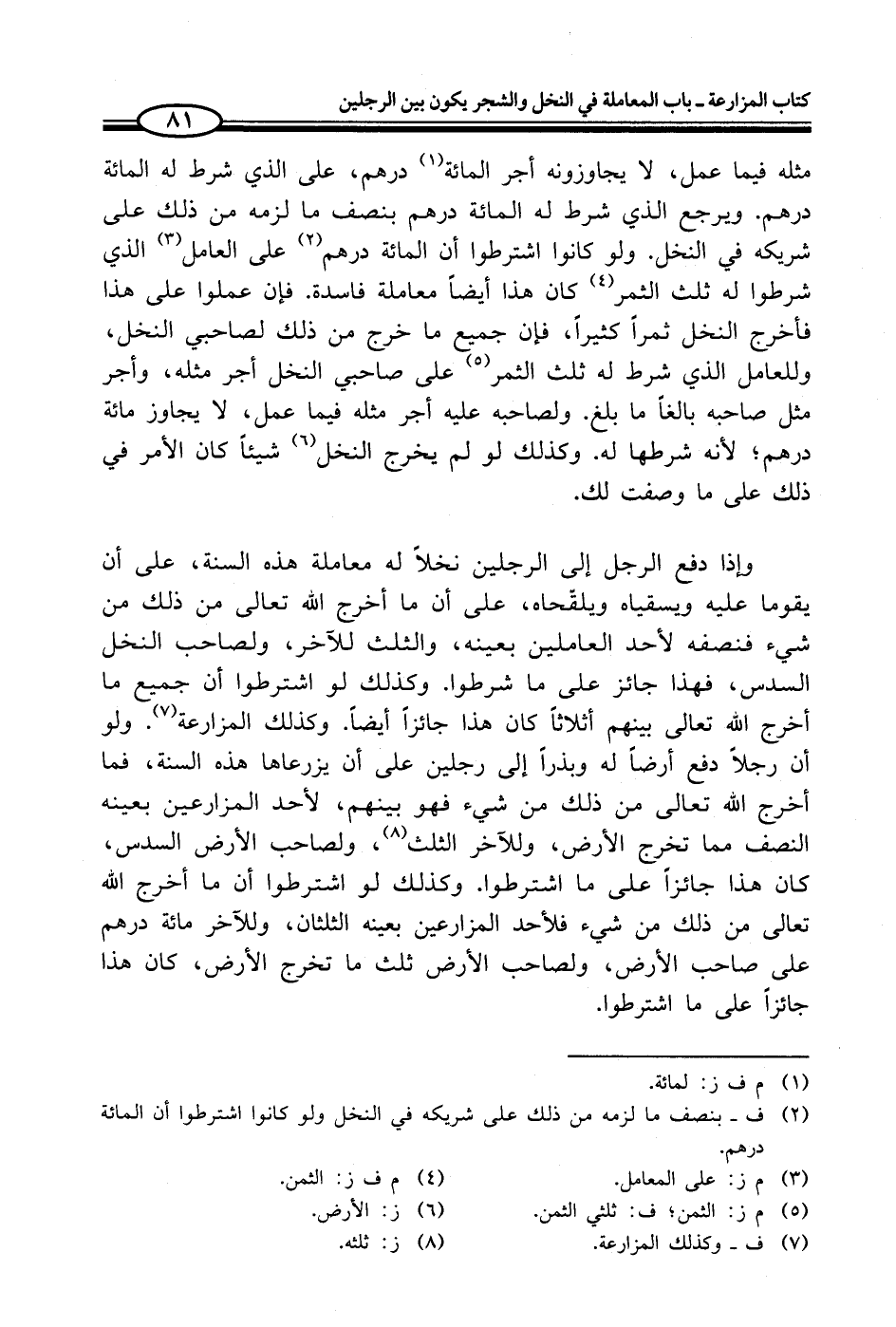 وإذا دفع الرجل إلى الرجلين نخلاً له معاملة هذه السنة، على أن يقوما عليه ويسقياه ويلقّحاه، على أن ما أخرج الله تعالى من ذلك من شيء فنصفه لأحد العاملين بعينه، والثلث للآخر، ولصاحب النخل السدس، فهذا جائز على ما شرطوا. وكذلك لو اشترطوا أن جميع ما أخرج الله تعالى بينهم أثلاثاً كان هذا جائزاً أيضاً. وكذلك المزارعة (¬7). ولو أن رجلاً دفع أرضاً له وبذراً إلى رجلين على أن يزرعاها هذه السنة، فما أخرج الله تعالى من ذلك من شيء فهو بينهم، لأحد المزارعين بعينه النصف مما تخرج الأرض، وللآخر الثلث (¬8)، ولصاحب الأرض السدس، كان هذا جائزاً على ما اشترطوا. وكذلك لو اشترطوا أن ما أخرج الله تعالى من ذلك من شيء فلأحد المزارعين بعينه الثلثان، وللآخر مائة درهم على صاحب الأرض، ولصاحب الأرض ثلث ما تخرج الأرض، كان هذا جائزاً على ما اشترطوا.