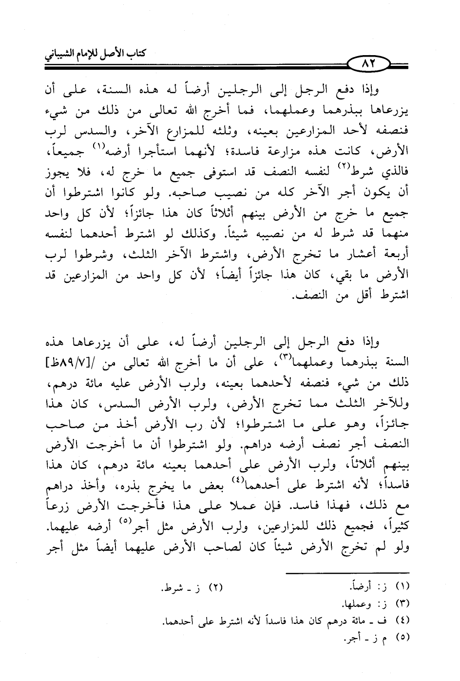 وإذا دفع الرجل إلى الرجلين أرضاً له هذه السنة، على أن يزرعاها ببذرهما وعملهما، فما أخرج الله تعالى من ذلك من شيء فنصفه لأحد المزارعين بعينه، وثلثه للمزارع الآخر، والسدس لرب الأرض، كانت هذه مزارعة فاسدة؛ لأنهما استأجرا أرضه (¬1) جميعاً، فالذي شرط (¬2) لنفسه النصف قد استوفى جميع ما خرج له، فلا يجوز أن يكون أجر الآخر كله من نصيب صاحبه. ولو كانوا اشترطوا أن جميع ما خرج من الأرض بينهم أثلاثاً كان هذا جائزاً؛ لأن كل واحد منهما قد شرط له من نصيبه شيئاً. وكذلك لو اشترط أحدهما لنفسه أربعة أعشار ما تخرج الأرض، واشترط الآخر الثلث، وشرطوا لرب الأرض ما بقي، كان هذا جائزاً أيضاً؛ لأن كل واحد من المزارعين قد اشترط أقل من النصف.