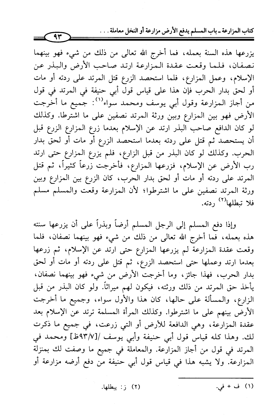 يزرعها هذه السنة بعمله، فما أخرج الله تعالى من ذلك من شيء فهو بينهما نصفان، فلما وقعت عقدة المزارعة ارتد صاحب الأرض والبذر عن الإسلام، وعمل المزارع، فلما استحصد الزرع قتل المرتد على ردته أو مات أو لحق بدار الحرب فإن هذا على قياس قول أبي حنيفة في المرتد في قول من أجاز المزارعة وقول أبي يوسف ومحمد سواء (¬1): جميع ما أخرجت الأرض فهو بين المزارع وبين ورثة المرتد نصفين على ما اشترطا. وكذلك لو كان الدافع صاحب البذر ارتد عن الإسلام بعدما زرع المزارع الزرع قبل أن يستحصد ثم قتل على ردته بعدما استحصد الزرع أو مات أو لحق بدار الحرب. وكذلك لو كان البذر من قبل الزارع، فلم يزرع المزارع حتى ارتد رب الأرض عن الإسلام، فزرعها المزارع، فأخرجت زرعاً كثيراً، ثم قتل المرتد على ردته أو مات أو لحق بدار الحرب، كان الزرع بين المزارع وبين ورثة المرتد نصفين على ما اشترطوا؛ لأن المزارعة وقعت والمسلم مسلم فلا تبطلها (¬2) ردته.