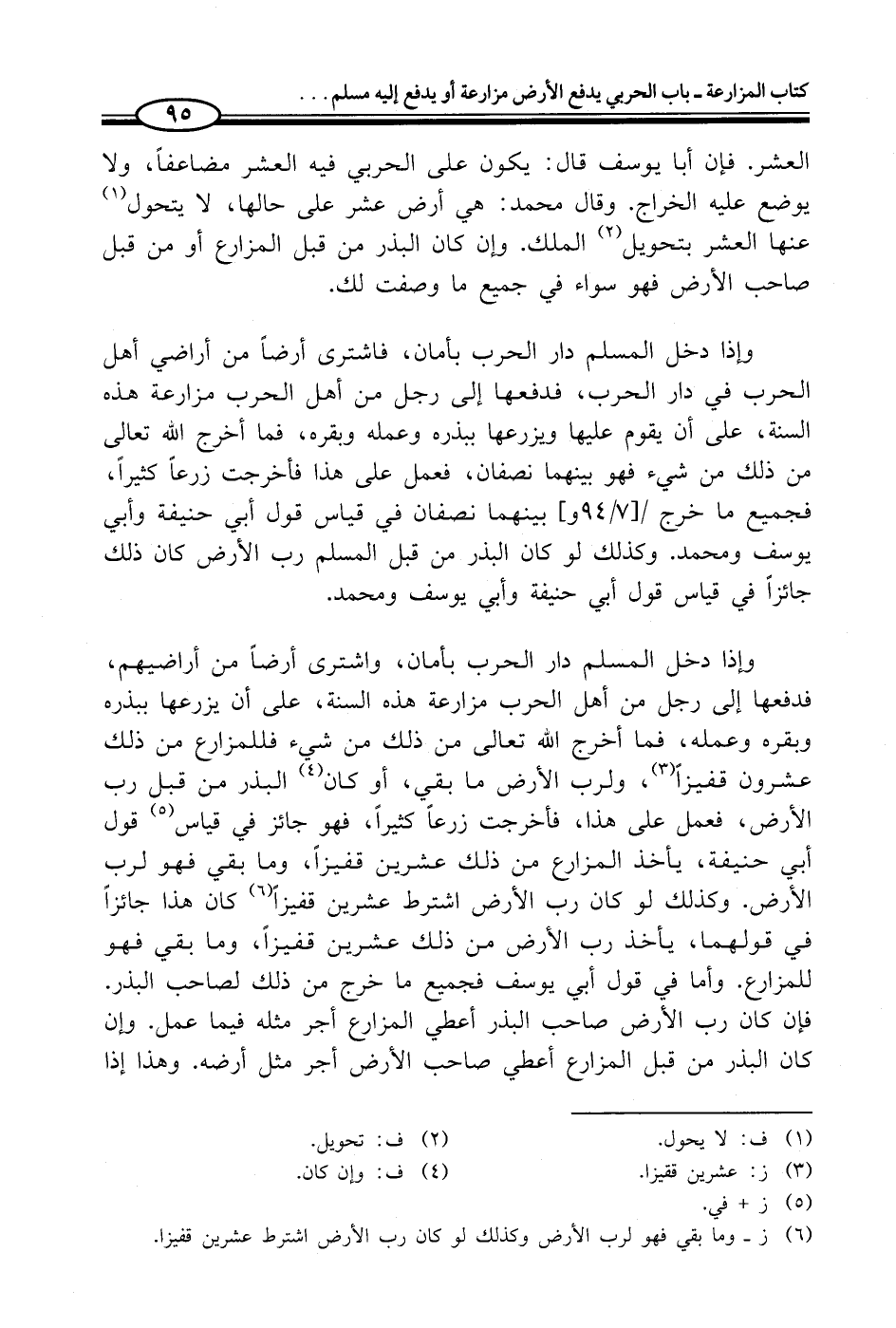 وإذا دخل المسلم دار الحرب بأمان، واشترى أرضاً من أراضيهم، فدفعها إلى رجل من أهل الحرب مزارعة هذه السنة، على أن يزرعها ببذره وبقره وعمله، فما أخرج الله تعالى من ذلك من شيء فللمزارع من ذلك عشرون قفيزاً (¬3)، ولرب الأرض ما بقي، أو كان (¬4) البذر من قبل رب الأرض، فعمل على هذا، فأخرجت زرعاً كثيراً، فهو جائز في قياس (¬5) قول أبي حنيفة، يأخذ المزارع من ذلك عشرين قفيزاً، وما بقي فهو لرب الأرض. وكذلك لو كان رب الأرض اشترط عشرين قفيزاً (¬6) كان هذا جائزاً في قولهما، يأخذ رب الأرض من ذلك عشرين قفيزاً، وما بقي فهو للمزارع. وأما في قول أبي يوسف فجميع ما خرج من ذلك لصاحب البذر. فإن كان رب الأرض صاحب البذر أعطي المزارع أجر مثله فيما عمل. وإن كان البذر من قبل المزارع أعطي صاحب الأرض أجر مثل أرضه. وهذا إذا