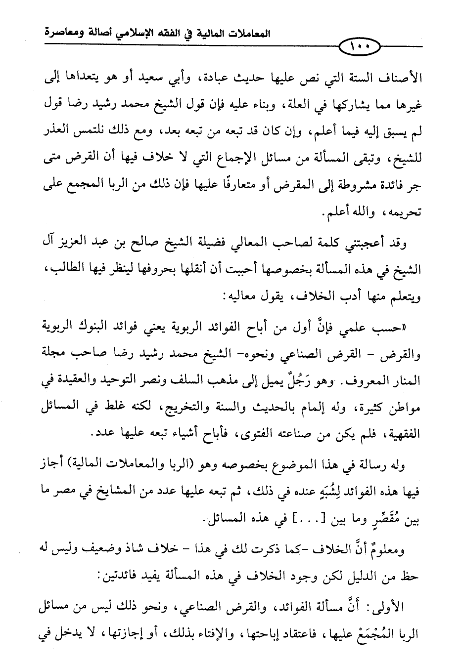 الأصناف الستة التي نص عليها حديث عبادة، وأبي سعيد أو هو يتعداها إلى غيرها مما يشاركها في العلة، وبناء عليه فإن قول الشيخ محمَّد رشيد رضا قول لم يسبق إليه فيما أعلم، وإن كان قد تبعه من تبعه بعد، ومع ذلك نلتمس العذر للشيخ، وتبقى المسألة من مسائل الإجماع التي لا خلاف فيها أن القرض متى جر فائدة مشروطة إلى المقرض أو متعارفًا عليها فإن ذلك من الربا المجمع على تحريمه، والله أعلم.