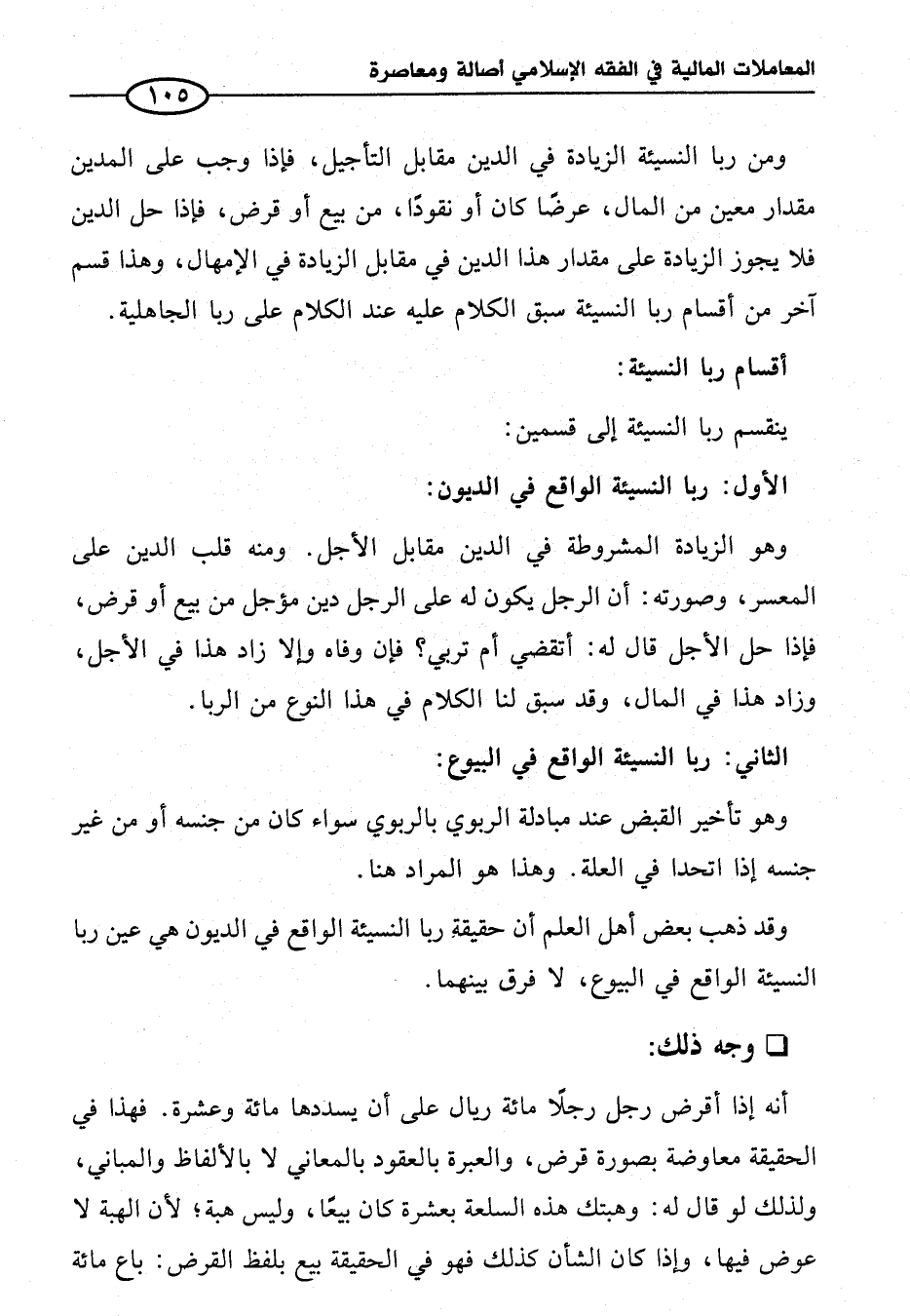 ومن ربا النسيئة الزيادة في الدين مقابل التأجيل، فإذا وجب على المدين مقدار معين من المال، عرضًا كان أو نقودًا، من بيع أو قرض، فإذا حل الدين فلا يجوز الزيادة على مقدار هذا الدين في مقابل الزيادة في الإمهال، وهذا قسم آخر من أقسام ربا النسيئة سبق الكلام عليه عند الكلام على ربا الجاهلية.