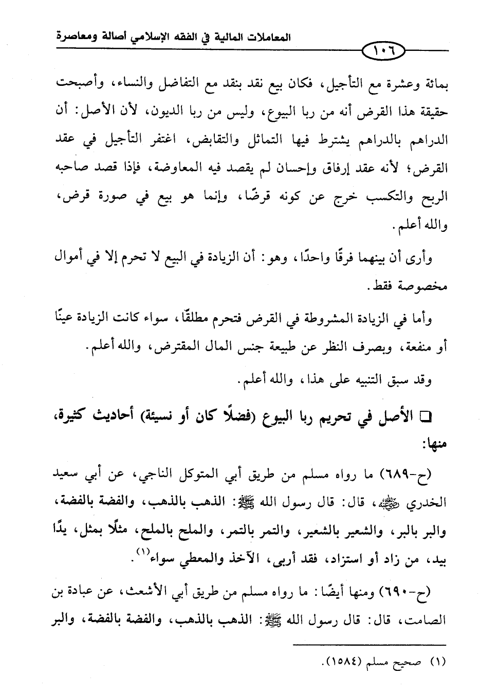 بمائة وعشرة مع التأجيل، فكان بيع نقد بنقد مع التفاضل والنساء، وأصبحت حقيقة هذا القرض أنه من ربا البيوع، وليس من ربا الديون؛ لأن الأصل: أن الدراهم بالدراهم يشترط فيها التماثل والتقابض، اغتفر التأجيل في عقد القرض؛ لأنه عقد إرفاق وإحسان لم يقصد فيه المعاوضة، فإذا قصد صاحبه الربح والتكسب خرج عن كونه قرضًا، وإنما هو بيع في صورة قرض، والله أعلم.