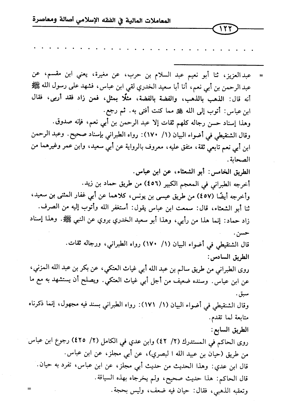 = عبد العزيز، ثنا أبو نعيم عبد السلام بن حرب، عن مغيرة، يعني ابن مقسم، عن عبد الرحمن بن أبي نعم، أنا أبا سعيد الخدري لقي ابن عباس، فشهد على رسول الله - صلى الله عليه وسلم - أنه قال: الذهب بالذهب، والفضة بالفضة، مثلًا بمثل، فإن زاد فقد أربى، فقال ابن عباس: أتوب إلى الله عز وجل مما كنت أفتى به. ثم رجع.
