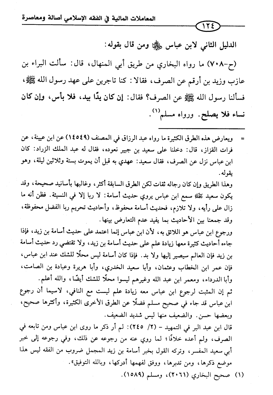 (ح-٧٠٨) ما رواه البخاري من طريق أبي المنهال، قال: سألت البراء بن عازب وزيد بن أرقم عن الصرف، فقالا: كنا تاجرين على عهد رسول الله - صلى الله عليه وسلم -، فسألنا رسول الله - صلى الله عليه وسلم - عن الصرف؟ فقال: إن كان يدًا بيد، فلا بأس، وإن كان نساء فلا يصلح. ورواه مسلم (¬١).