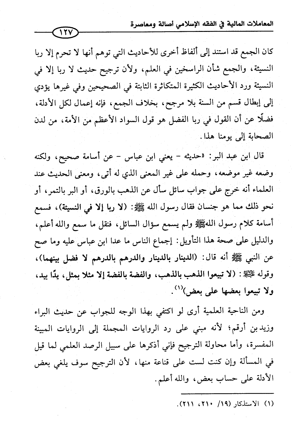 كان الجمع قد استند إلى ألفاظ أخرى للأحاديث التي توهم أنها لا تحرم إلا ربا النسيئة، والجمع شأن الراسخين في العلم، ولأن ترجيح حديث لا ربا إلا في النسيئة ورد الأحاديث الكثيرة المتكاثرة الثابتة في الصحيحين وفي غيرها يؤدي إلى إبطال قسم من السنة بلا مرجح، بخلاف الجمع، فإنه إعمال لكل الأدلة، فضلاً عن أن القول في ربا الفضل هو قول السواد الأعظم من الأمة، من لدن الصحابة إلى يومنا هذا.