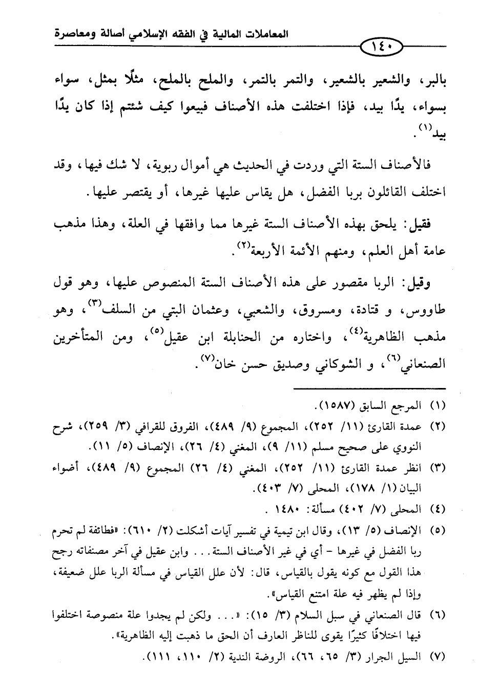 (¬٥) الإنصاف (٥/ ١٣)، وقال ابن تيمية في تفسير آيات أشكلت (٢/ ٦١٠): "فطائفة لم تحرم ربا الفضل في غيرها - أي في غير الأصناف الستة ... وابن عقيل في آخر مصنفاته رجح هذا القول مع كونه يقول بالقياس، قال: لأن علل القياس في مسألة الربا علل ضعيفة، وإذا لم يظهر فيه علة امتنع القياس".