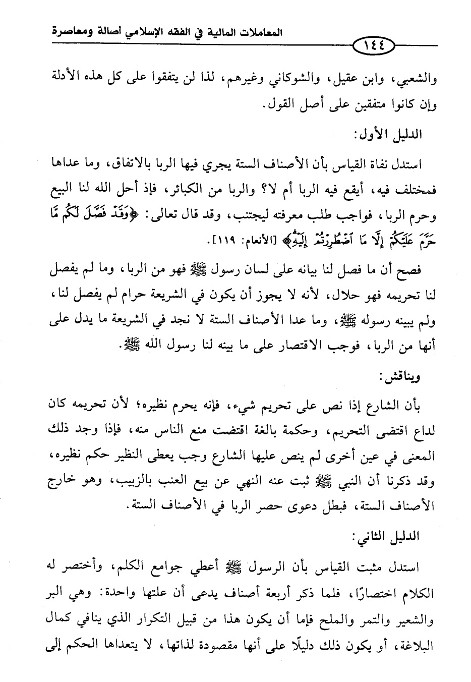استدل نفاة القياس بأن الأصناف الستة يجري فيها الربا بالاتفاق، وما عداها فمختلف فيه، أيقع فيه الربا أم لا؟ والربا من الكبائر، فإذ أحل الله لنا البيع وحرم الربا، فواجب طلب معرفته ليجتنب، وقد قال تعالى: {وَقَدْ فَصَّلَ لَكُمْ مَا حَرَّمَ عَلَيْكُمْ إِلَّا مَا اضْطُرِرْتُمْ إِلَيْهِ} [الأنعام: ١١٩].
